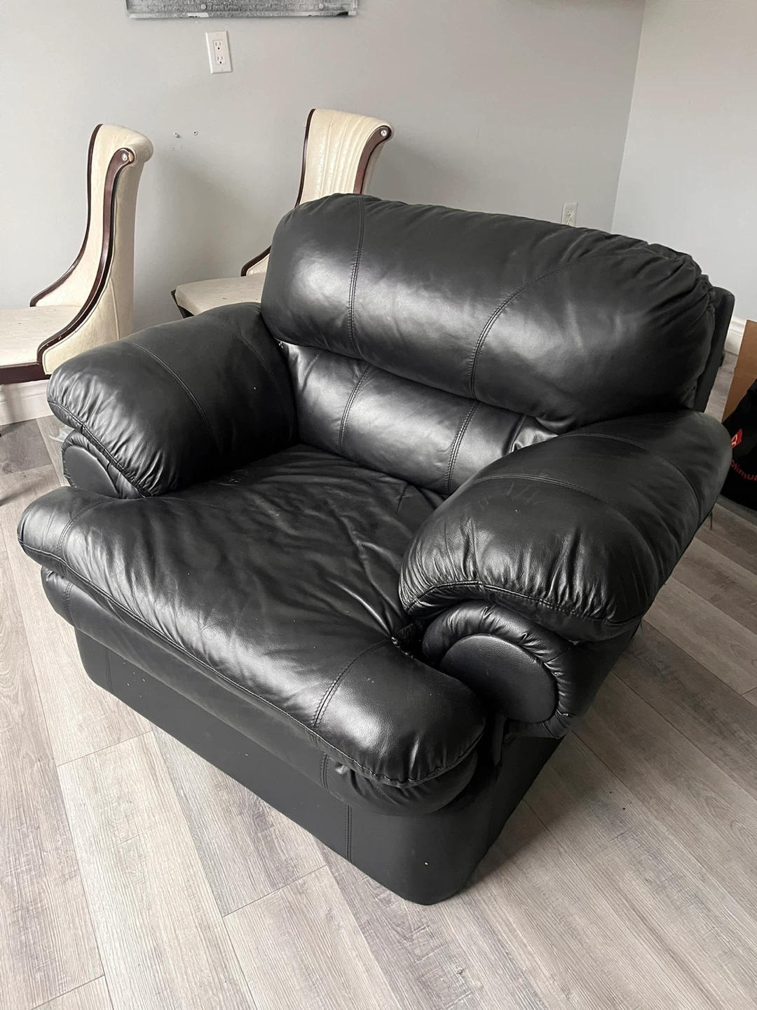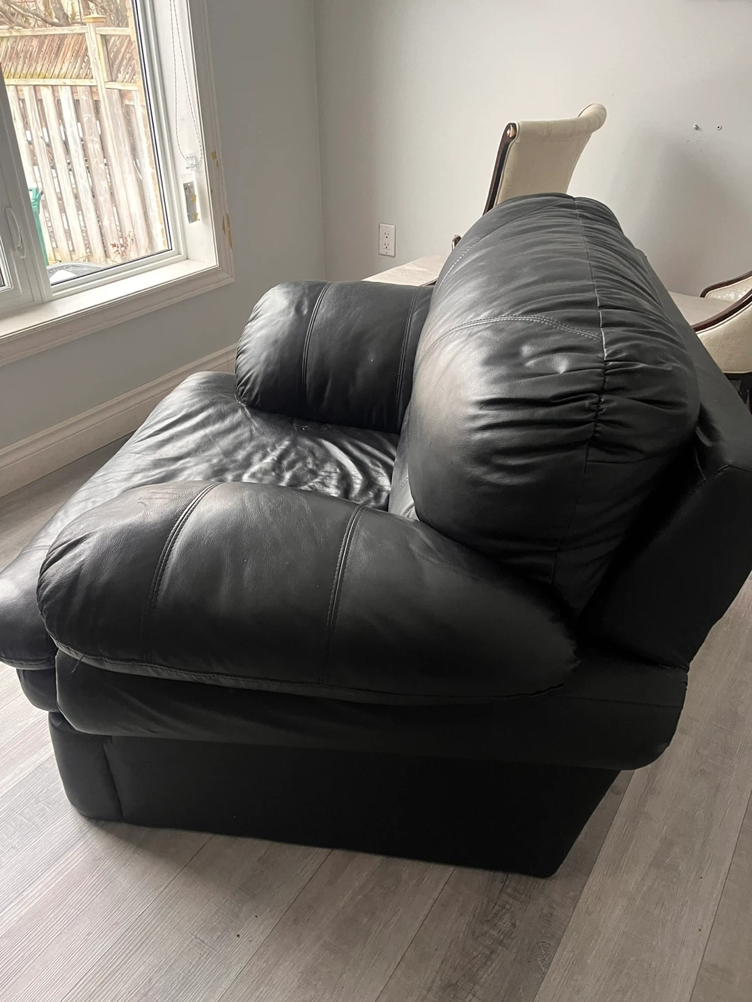 A comfortable black leather armchair. It's made of genuine leather. This chair would be useful for relaxing in any living space. It's spacious and plush!