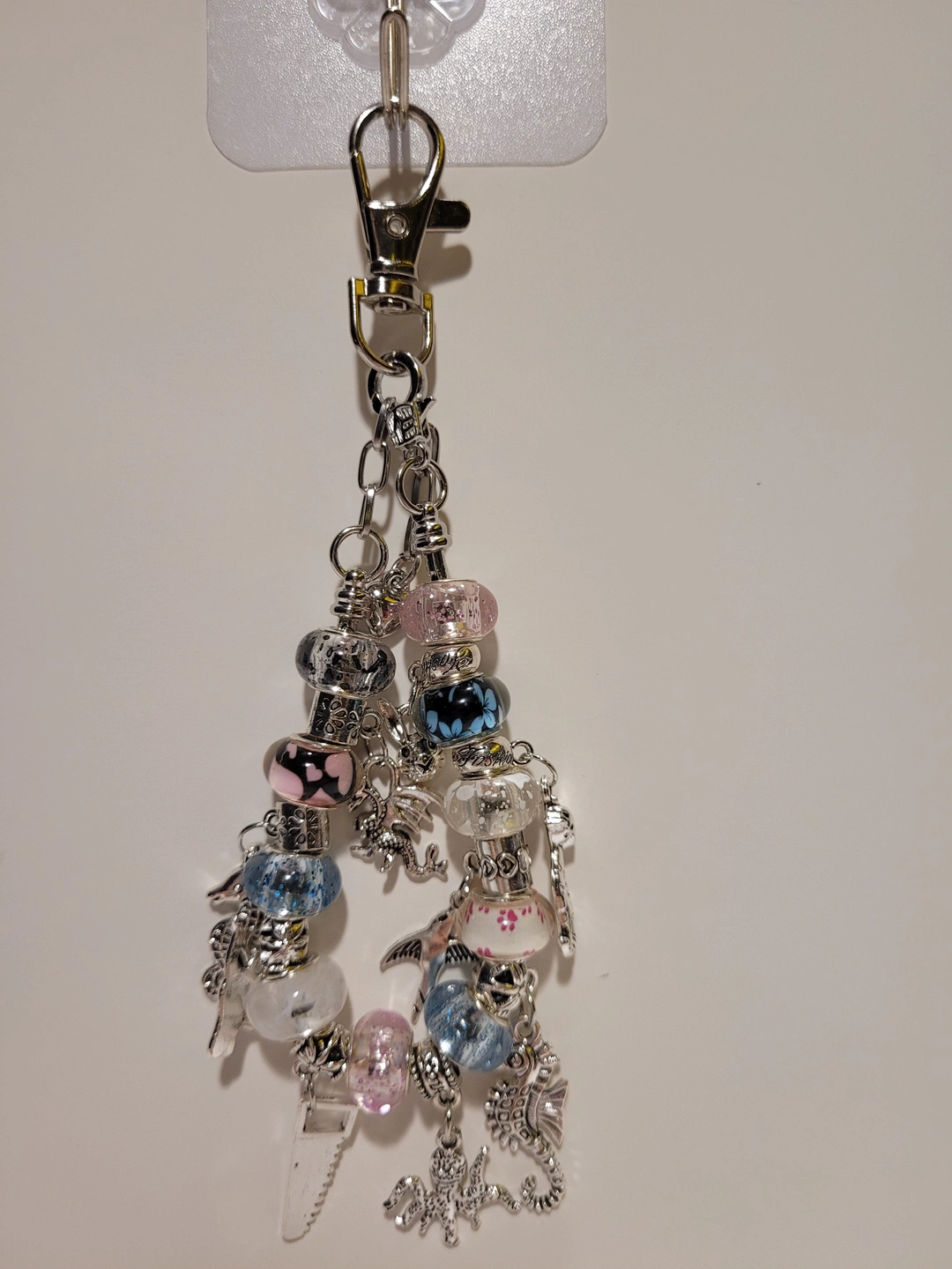 Check out this unique, handmade beaded charm keychain! It features a variety of colourful beads and cute silver charms, perfect for adding a personal touch to your keys or bag