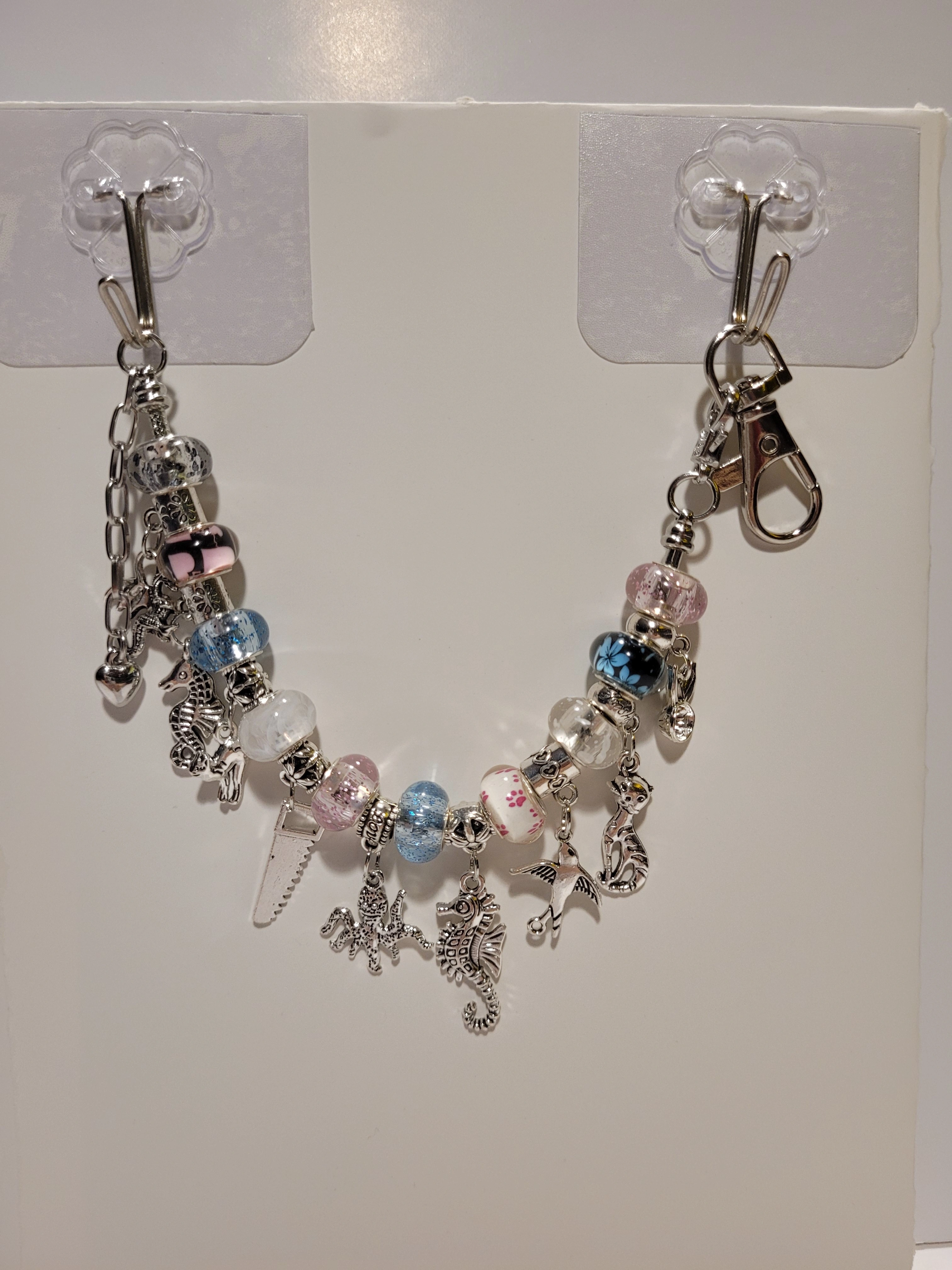Check out this unique, handmade beaded charm keychain! It features a variety of colourful beads and cute silver charms, perfect for adding a personal touch to your keys or bag