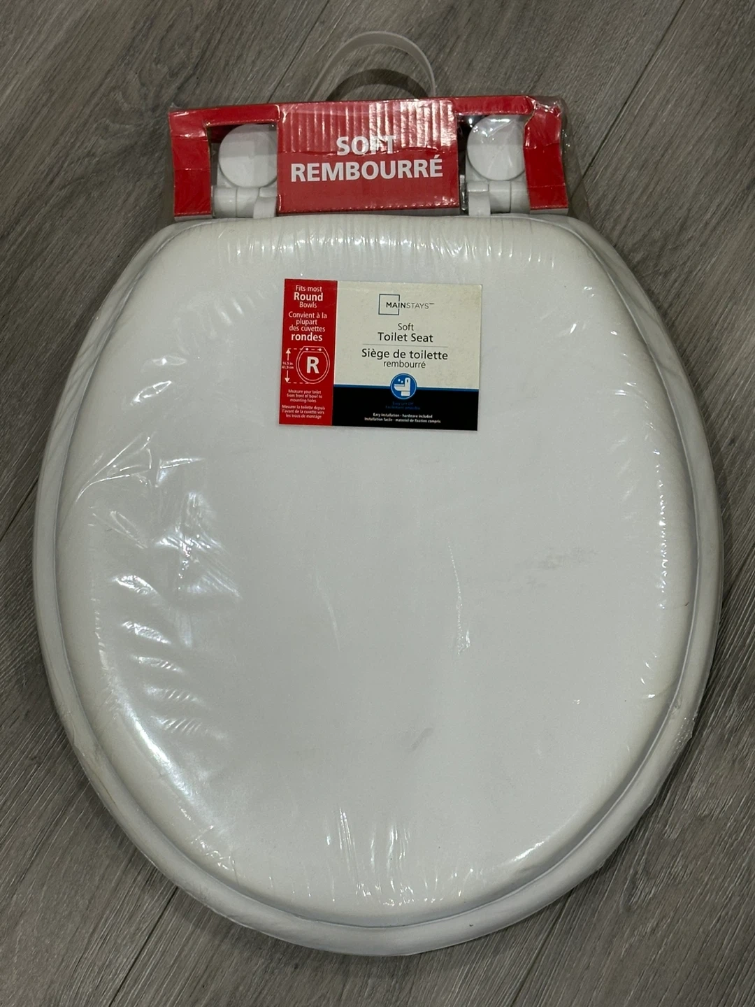 This is a Mainstays soft toilet seat in white. It's designed for round toilets. Includes mounting hardware for installation. Brand New in Original Packaging!