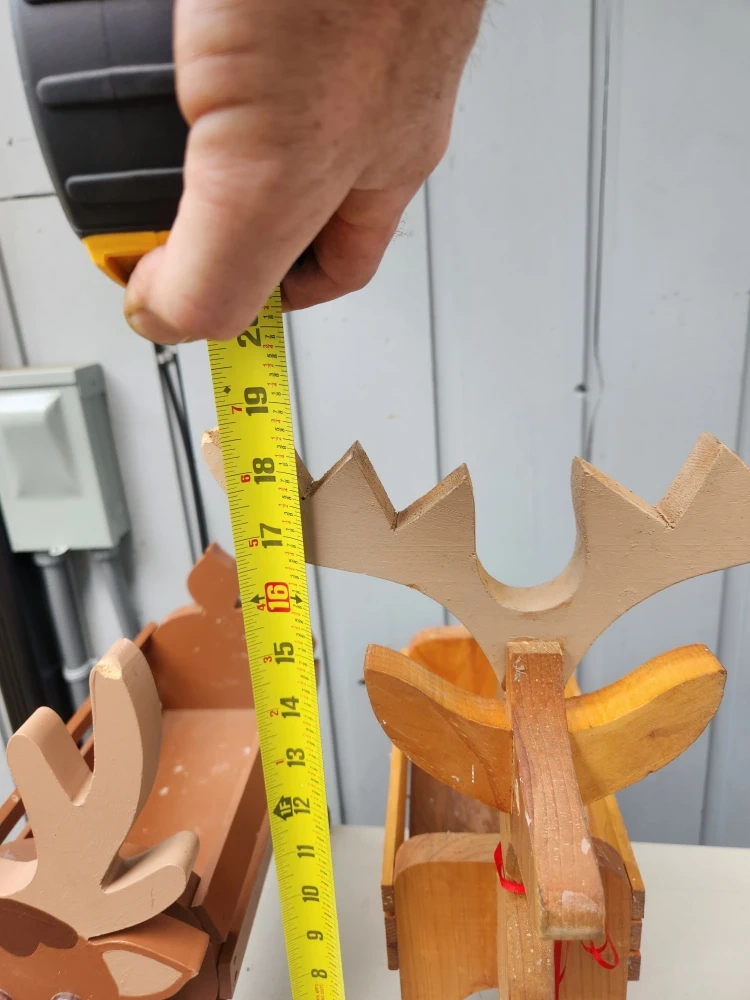 I'm selling a charming wooden reindeer planter! It's perfect for adding a touch of rustic charm to your home decor. The reindeer is made of wood and features a small planter box on its back, perfect for holding small plants or other decorative items. It measures approximately 14 inches tall.