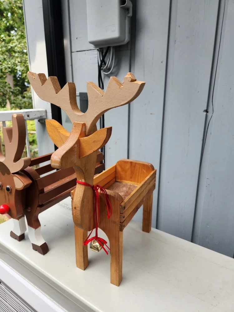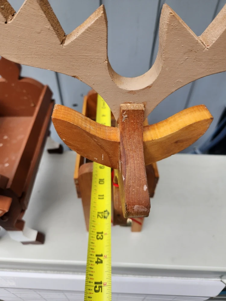 I'm selling a charming wooden reindeer planter! It's perfect for adding a touch of rustic charm to your home decor. The reindeer is made of wood and features a small planter box on its back, perfect for holding small plants or other decorative items. It measures approximately 14 inches tall.
