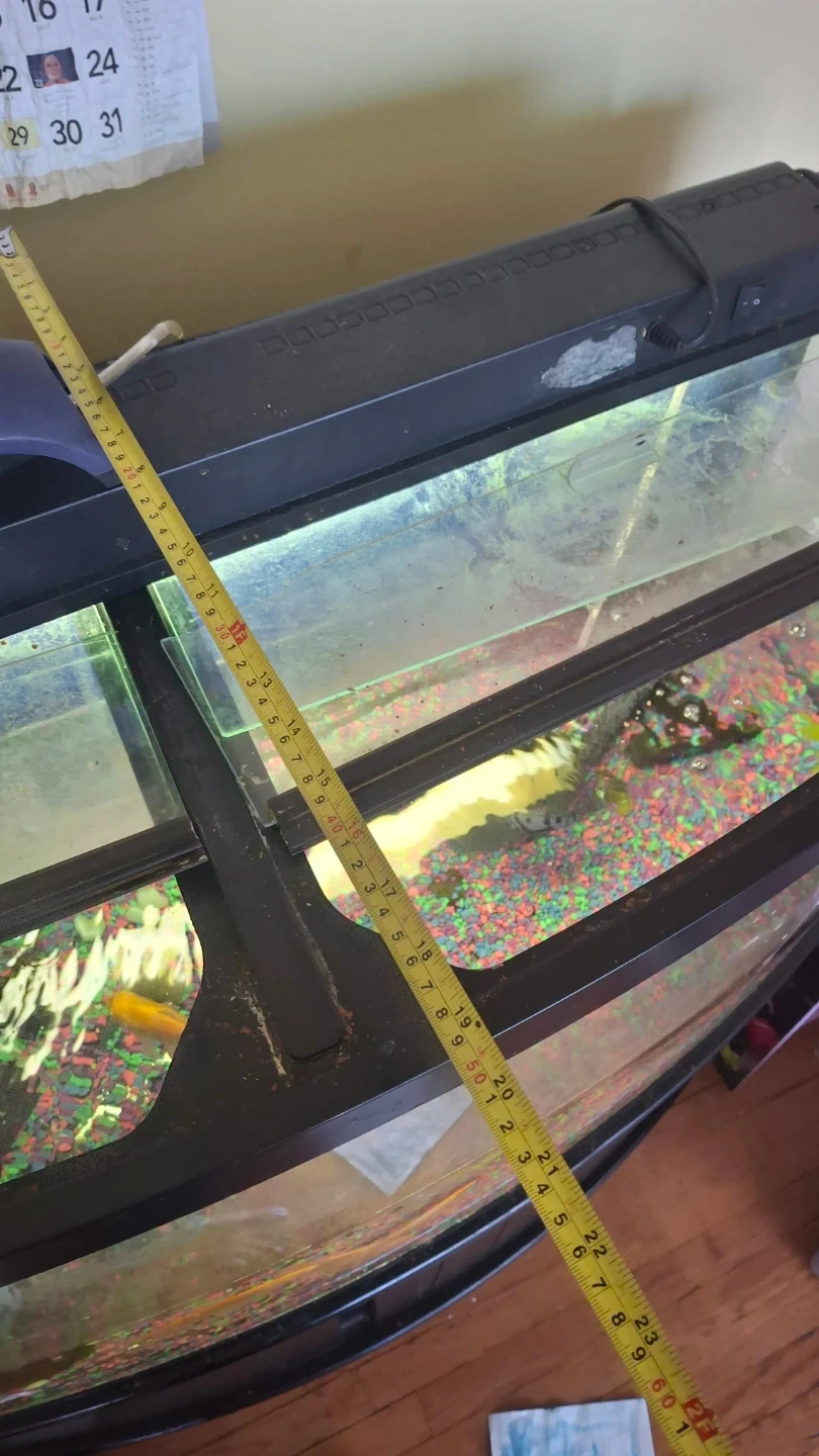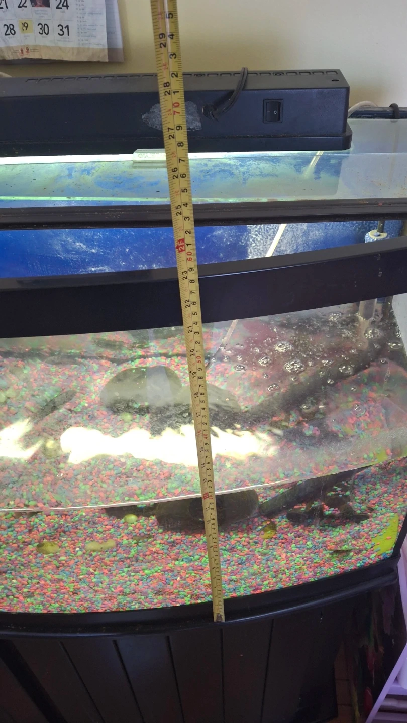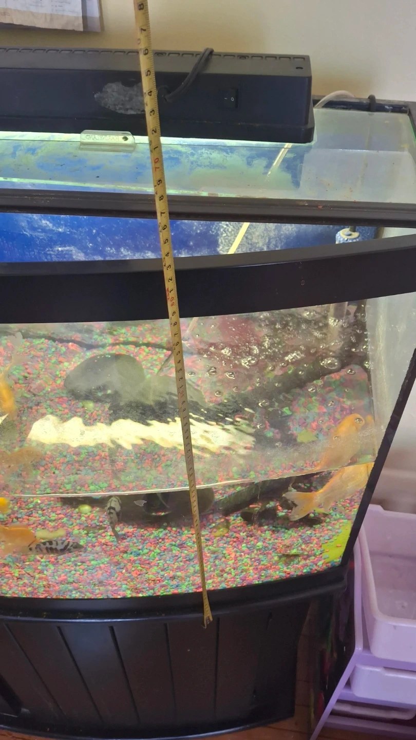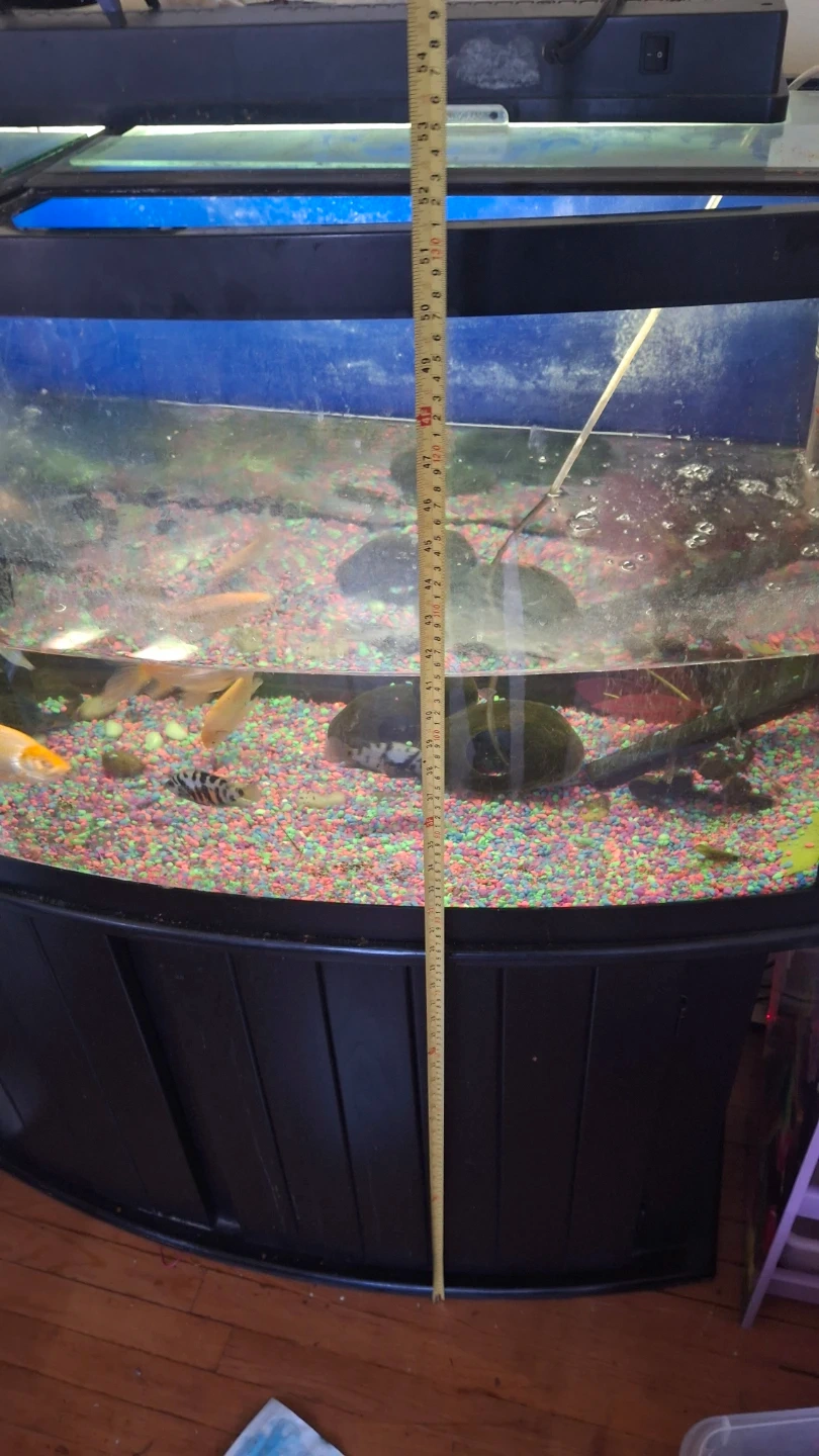 Curved glass aquarium tank with a black stand and hood. Measurements are approximately 36 inches wide and 24 inches tall. Includes gravel substrate and a light.