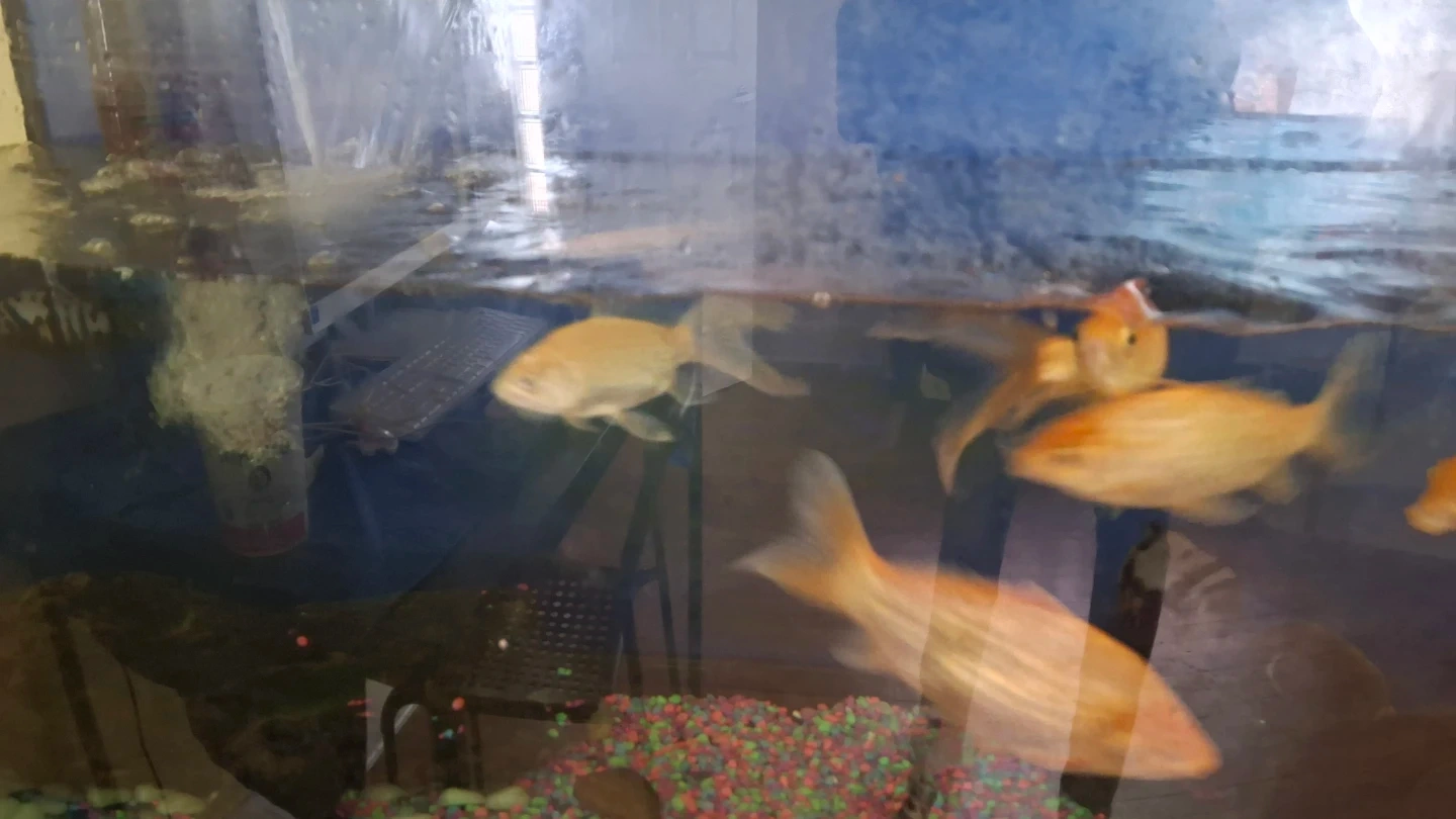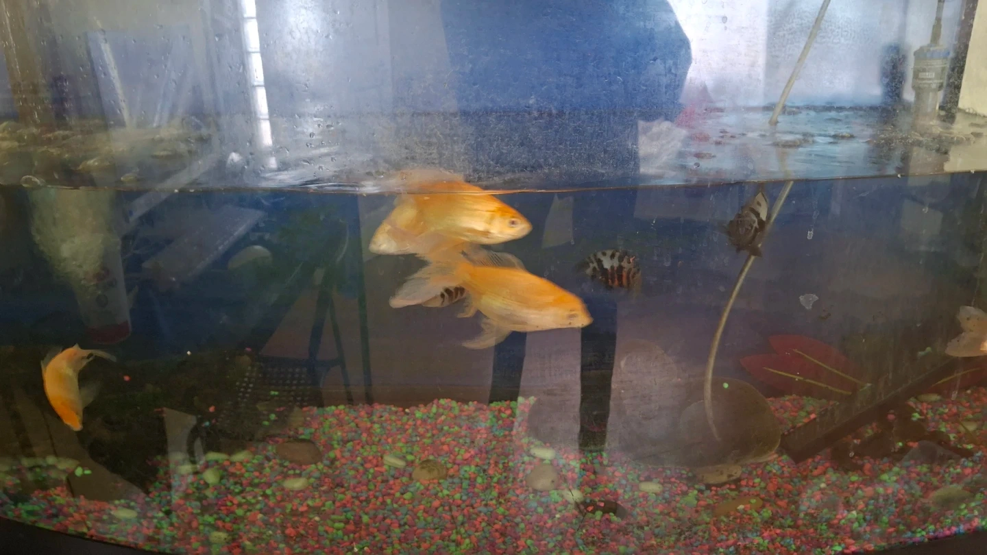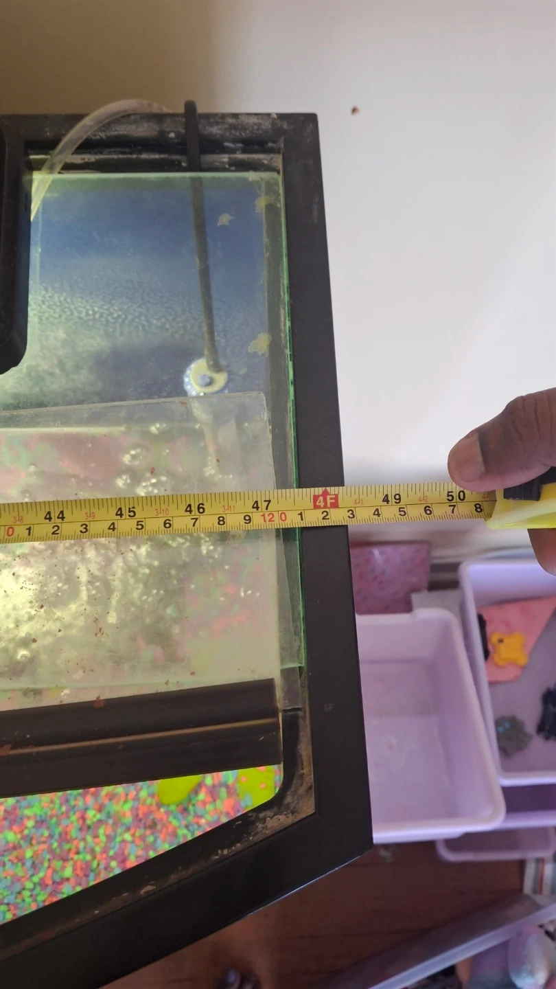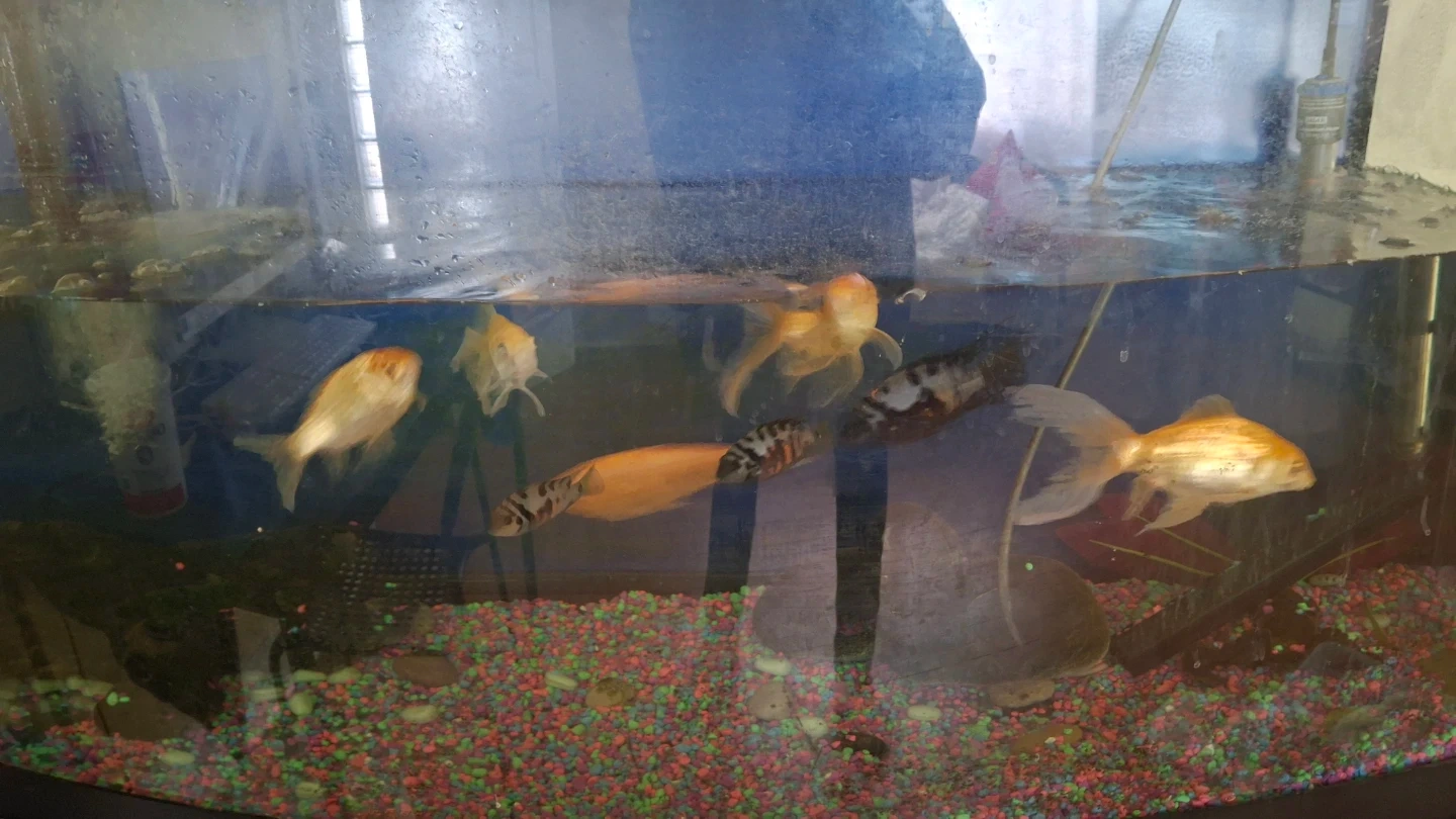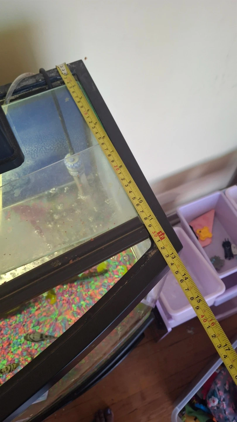 Curved glass aquarium tank with a black stand and hood. Measurements are approximately 36 inches wide and 24 inches tall. Includes gravel substrate and a light.