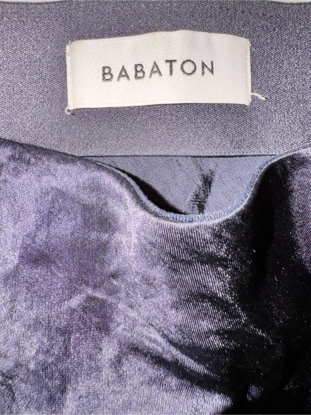 This is a navy blue midi skirt from BABATON. It's made of a satin-like material with a slight sheen. The skirt has a relaxed fit and is perfect for dressing up or down.