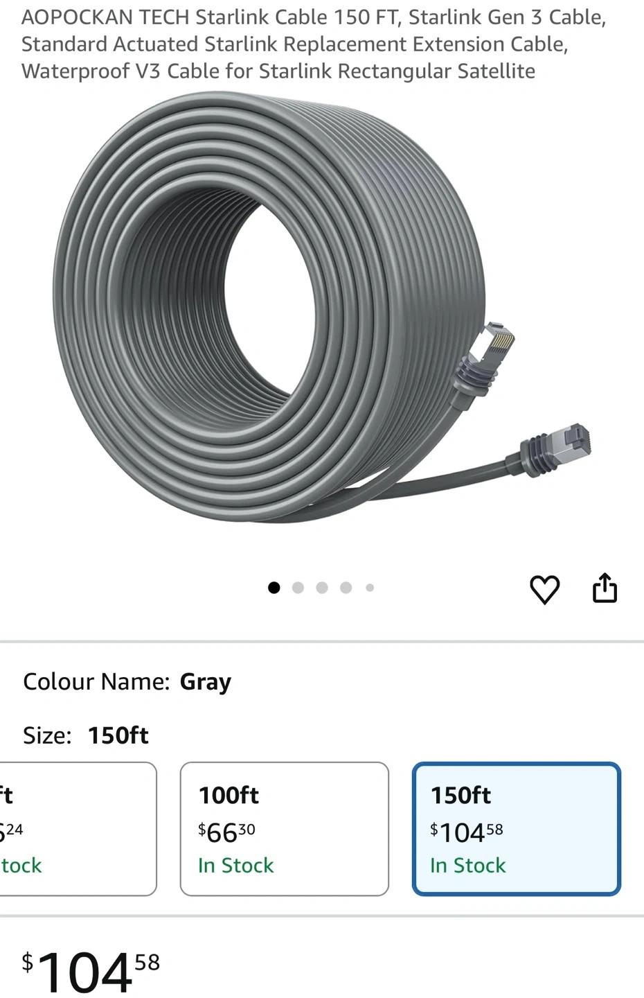Tech Starlink Cable, 150 FT in length. It's a Gen 3 cable, a standard actuated replacement extension cable, and waterproof. The cable is gray. Comes with the box!