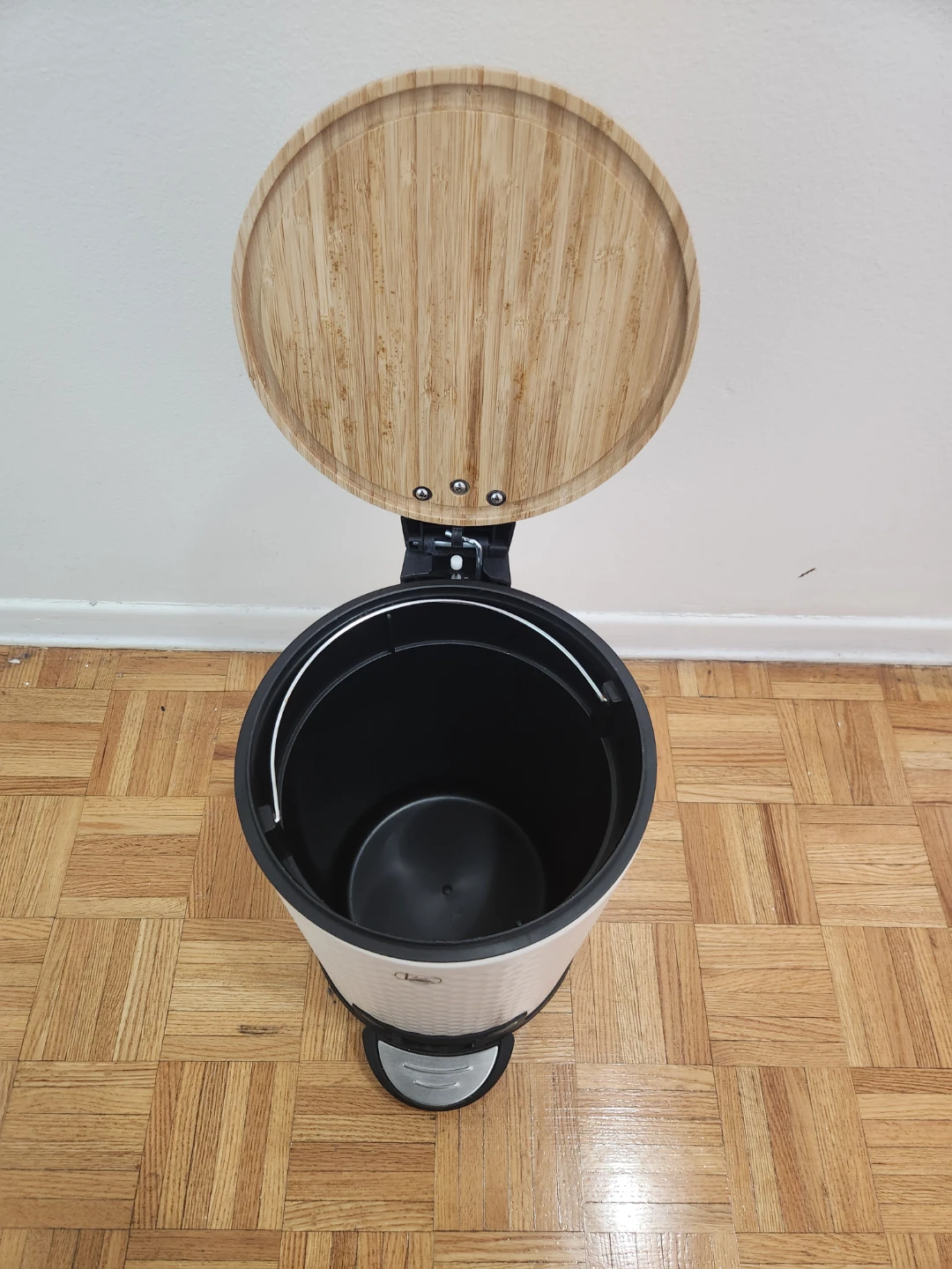White Foot Pedal Trash Can with Bamboo Lid