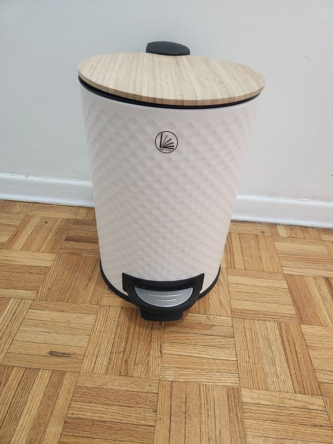 This white pedal trash can features a textured exterior and a stylish bamboo lid. It includes an inner bucket for easy cleaning and a foot pedal for hands-free operation. A nice addition to any kitchen or bathroom!