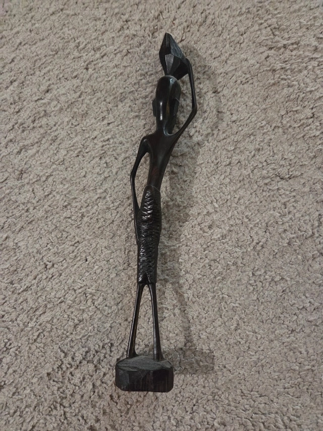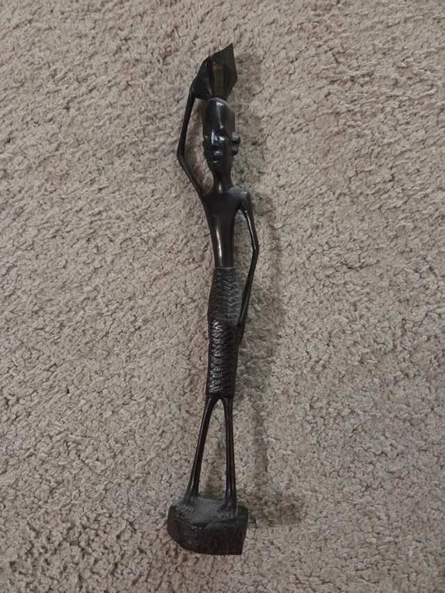 A unique and striking 10-inch vintage hand-carved sculpture in solid African Ebony. This piece depicts a woman balancing a large, faceted stone—a powerful symbol of strength, endurance, and the labor involved in building a home or community. Subject: Stylized female figure carrying a heavy, jagged stone on her head. Material: Carved from a single piece of genuine, high-density African Ebony (or Ironwood). It has a beautiful, dark natural patina and a significant weight for its size. Artistry: Features traditional elongated proportions and intricate textures on the skirt and stone, catching the light perfectly. Condition: Excellent vintage condition. The wood is solid with no cracks, chips, or repairs. Dimensions: 10 inches tall. This is a rare variation of the "Village Life" series and makes for a meaningful conversation piece in a Mid-Century Modern or global-themed decor.