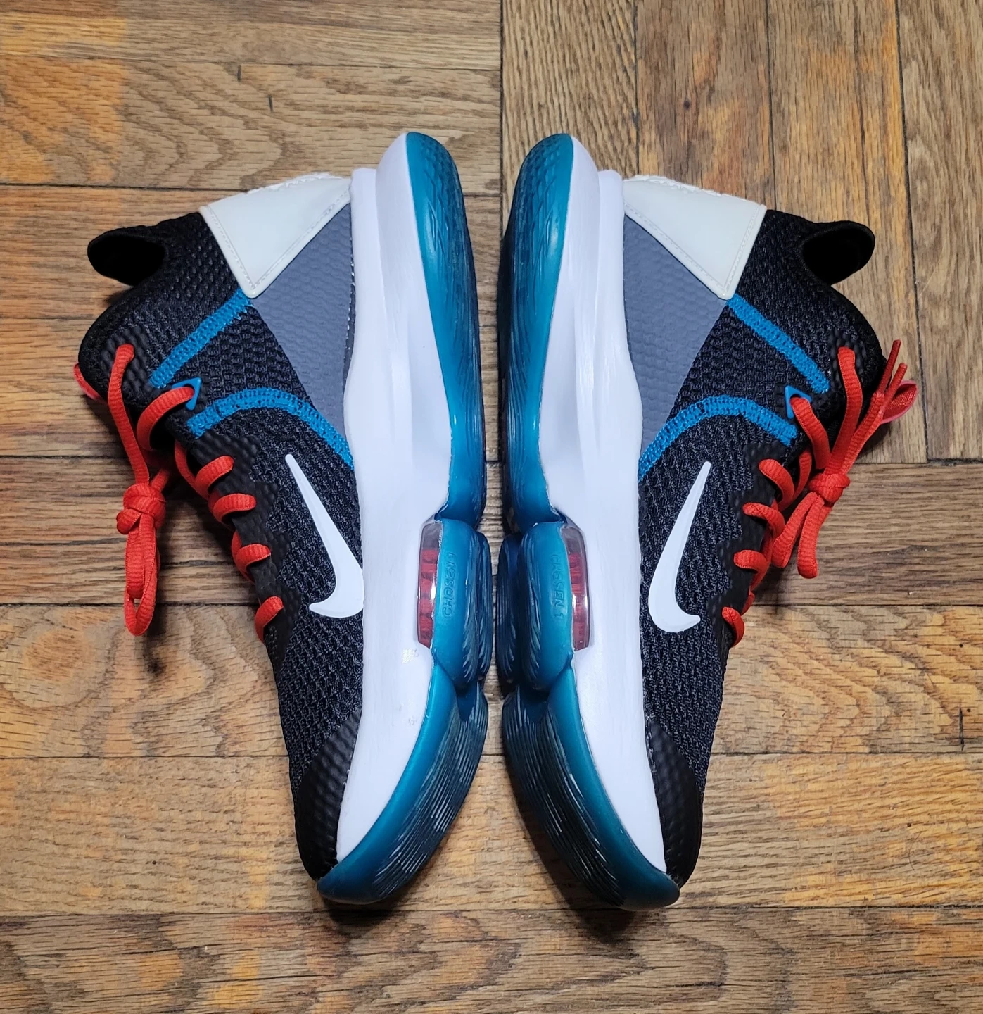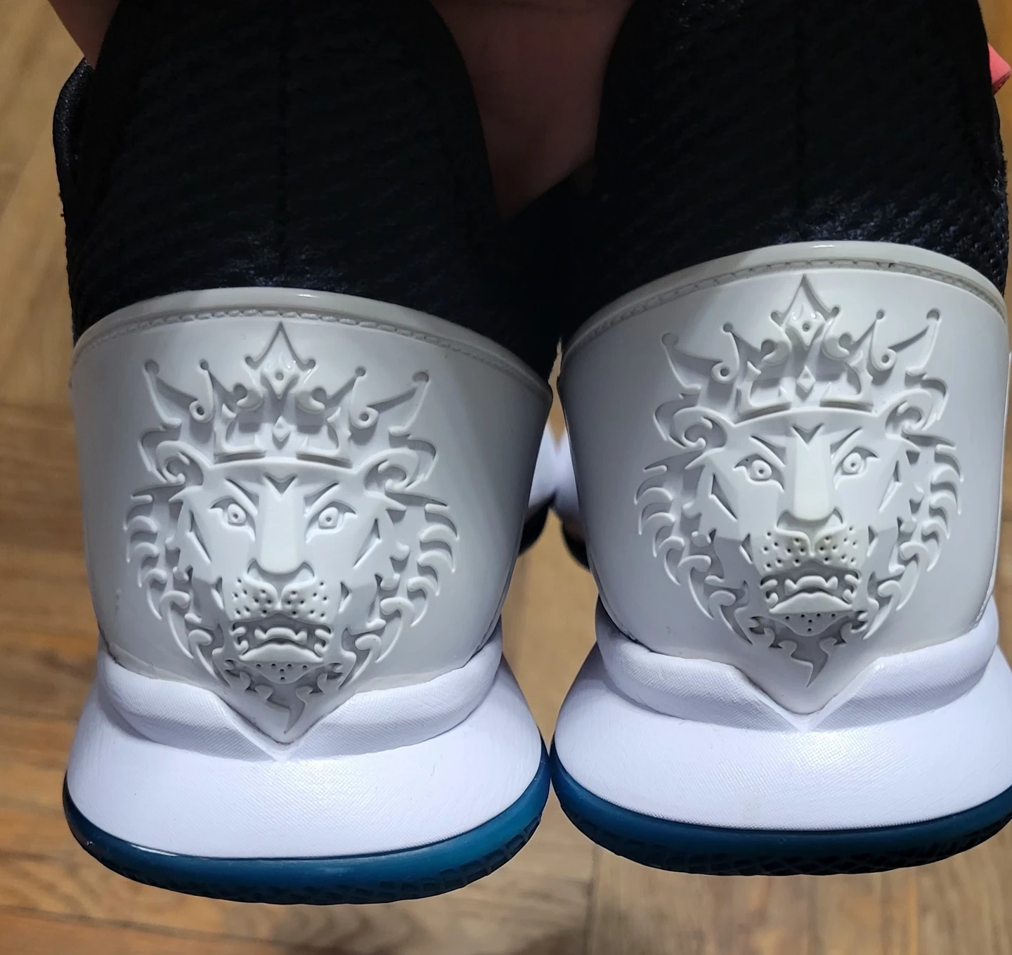 Nike LeBron Witness 5 basketball shoes. US Size 7. Black with red and blue accents. Features a lion emblem on the heel.