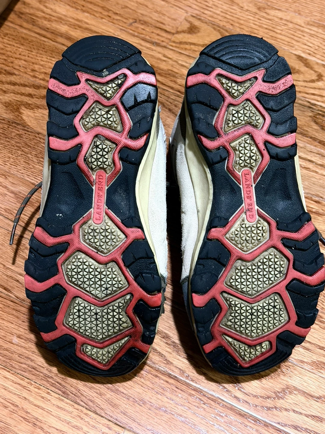 Lands' End women's mid-height winter boots. Suede and synthetic water resistant upper. Rubber sole with aggressive tread for traction. These boots are a light cream color with red and gray accents. Women’s Size 8.5
