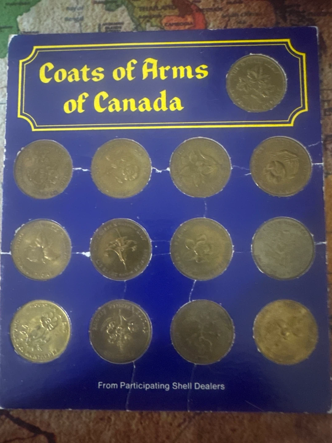 This set features two collectible coin cards: Floral Emblems of Canada and Coats of Arms of Canada. Each card displays twelve distinct coins, presented by participating Shell Dealers. A great addition for collectors interested in Canadian heritage and numismatics!