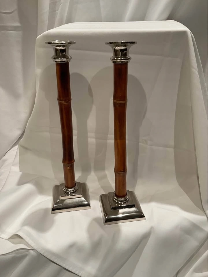 PAIR Of Bamboo Candlesticks With Silver Base. Height 16 Inches, Base 4”x4”. One has a crack at the back (see picture), priced accordingly. Smoke & Pet Free Home. Located in Richmond Hill / Bathurst & King Rd.