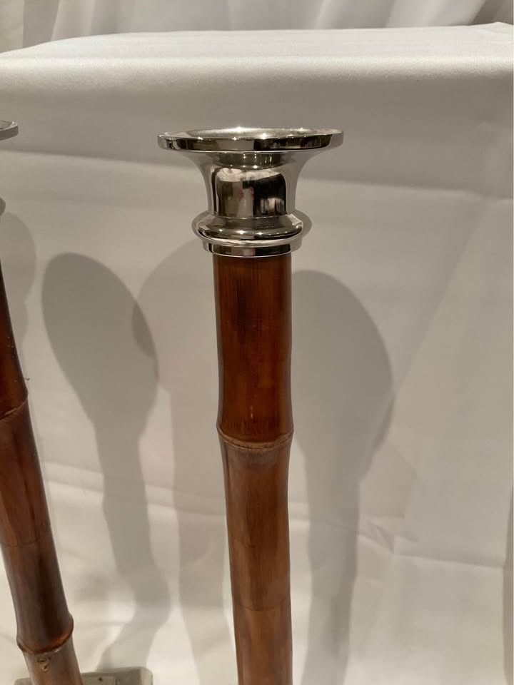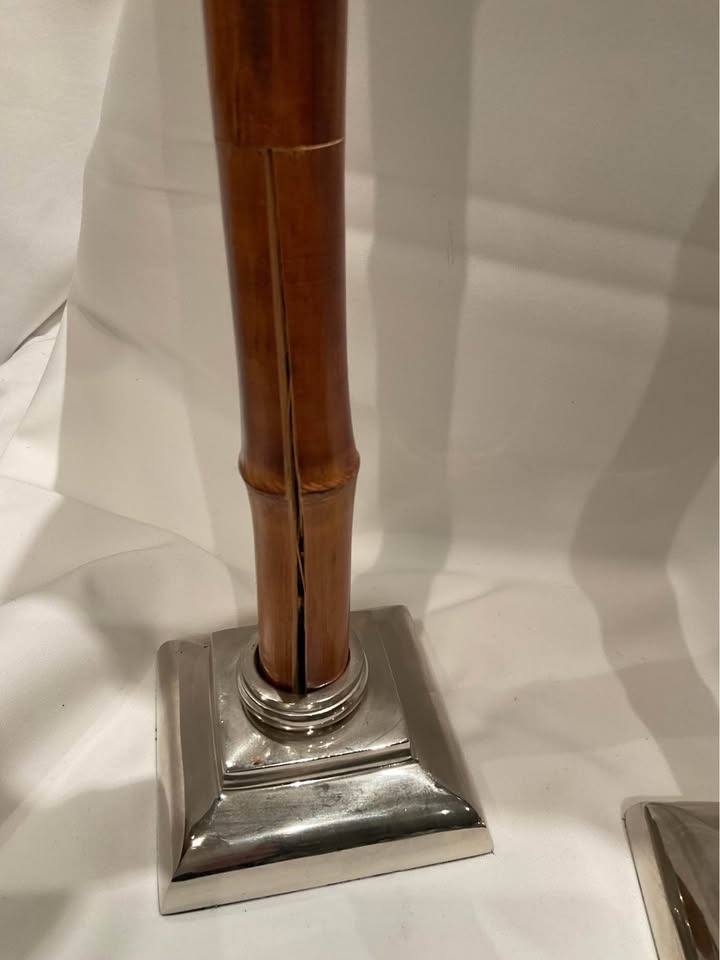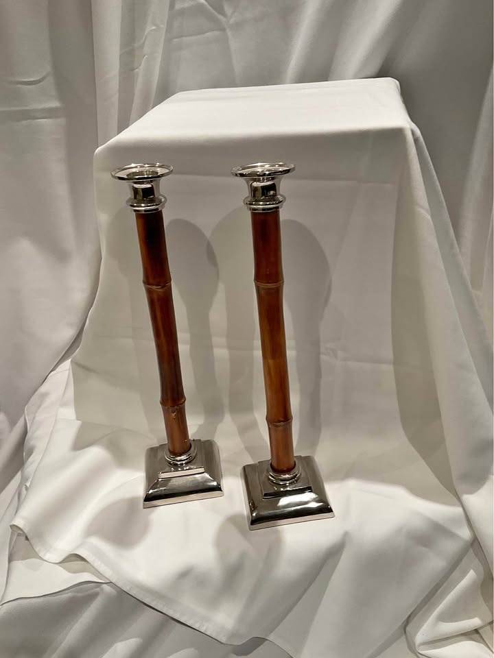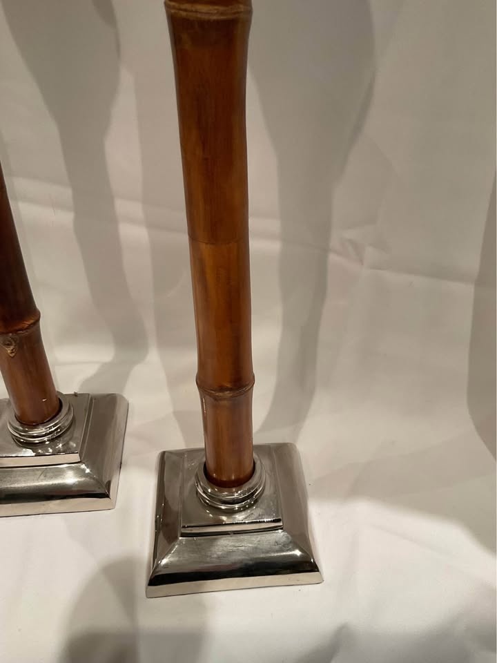 PAIR Of Bamboo Candlesticks With Silver Base. Height 16 Inches, Base 4”x4”. One has a crack at the back (see picture), priced accordingly. Smoke & Pet Free Home. Located in Richmond Hill / Bathurst & King Rd.