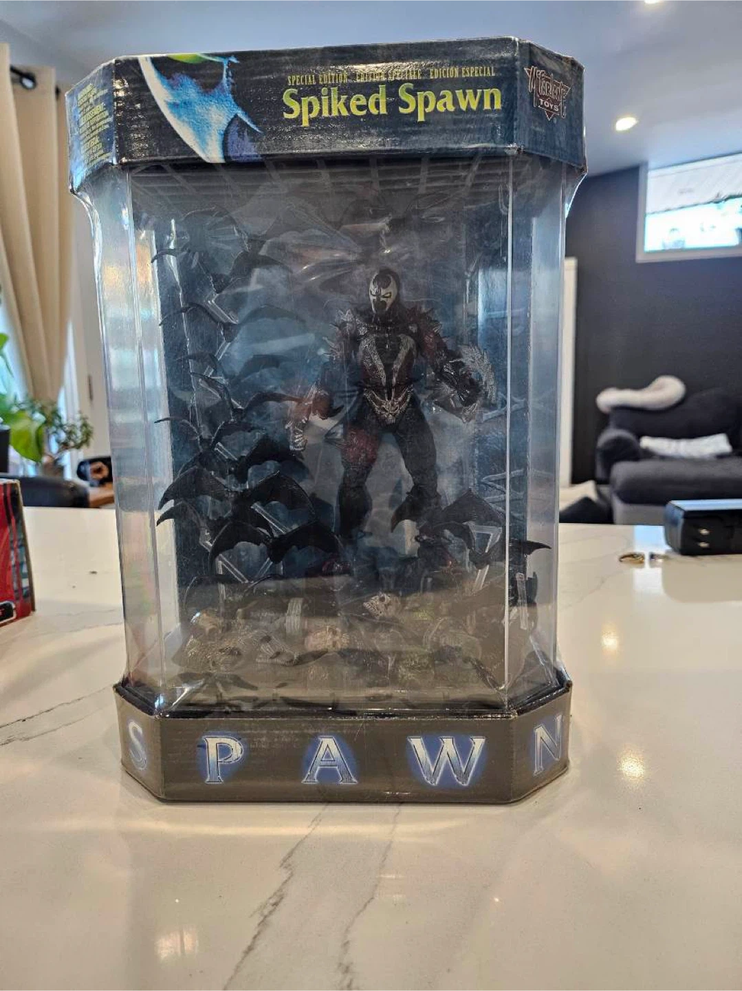 This is a Spiked Spawn action figure from McFarlane Toys. It's a special edition release in its original packaging. The figure includes its diorama base and accessories.