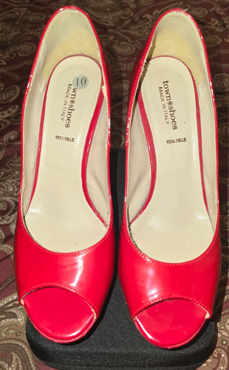 These striking red patent leather heels feature a bold platform and stiletto heel. Made in Italy with Vera Pelle (genuine leather). They're a size 10. A gorgeous pop of colour for any outfit!