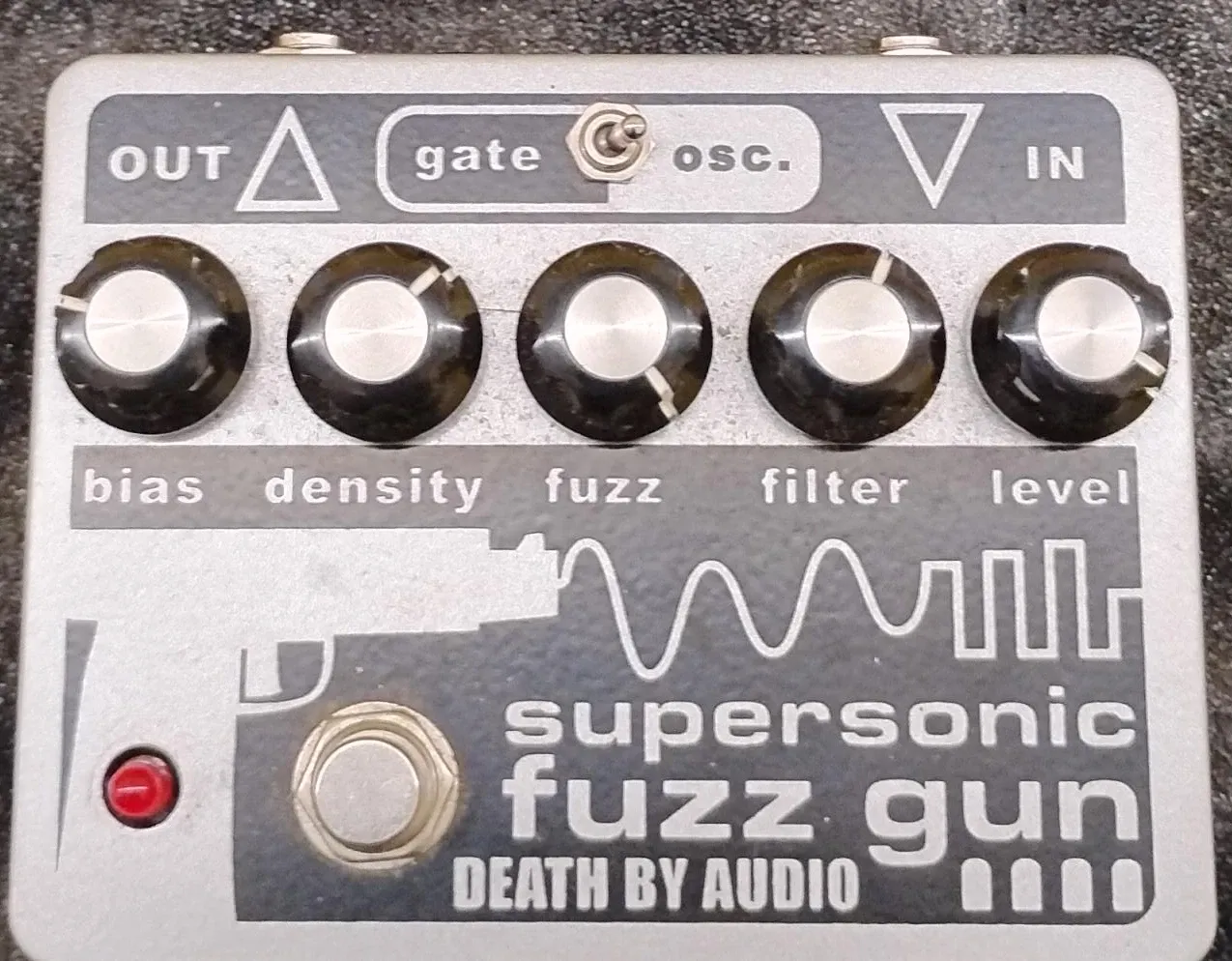 This is a Death By Audio Supersonic Fuzz Gun guitar effects pedal. It has controls for bias, density, fuzz, filter, and level. This pedal is known for its powerful fuzz tones.