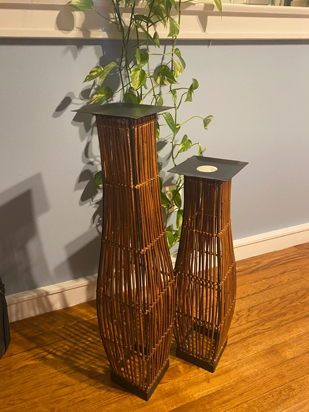 This set includes two decorative woven lanterns. They're made from natural materials with a brown finish. Each lantern has a square metal top for candles. Bought from Pier 1 Imports.