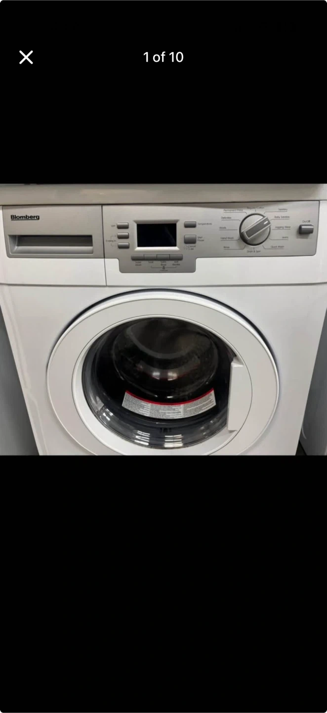 Blomberg front load washing machine. It's white and features a digital display with various wash cycles. This is a front load model.