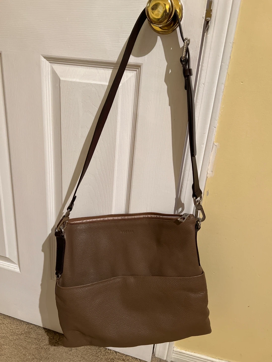 A stylish brown leather crossbody bag from RUDSAK. It features a zip-top closure with front pockets. Genuine leather material.