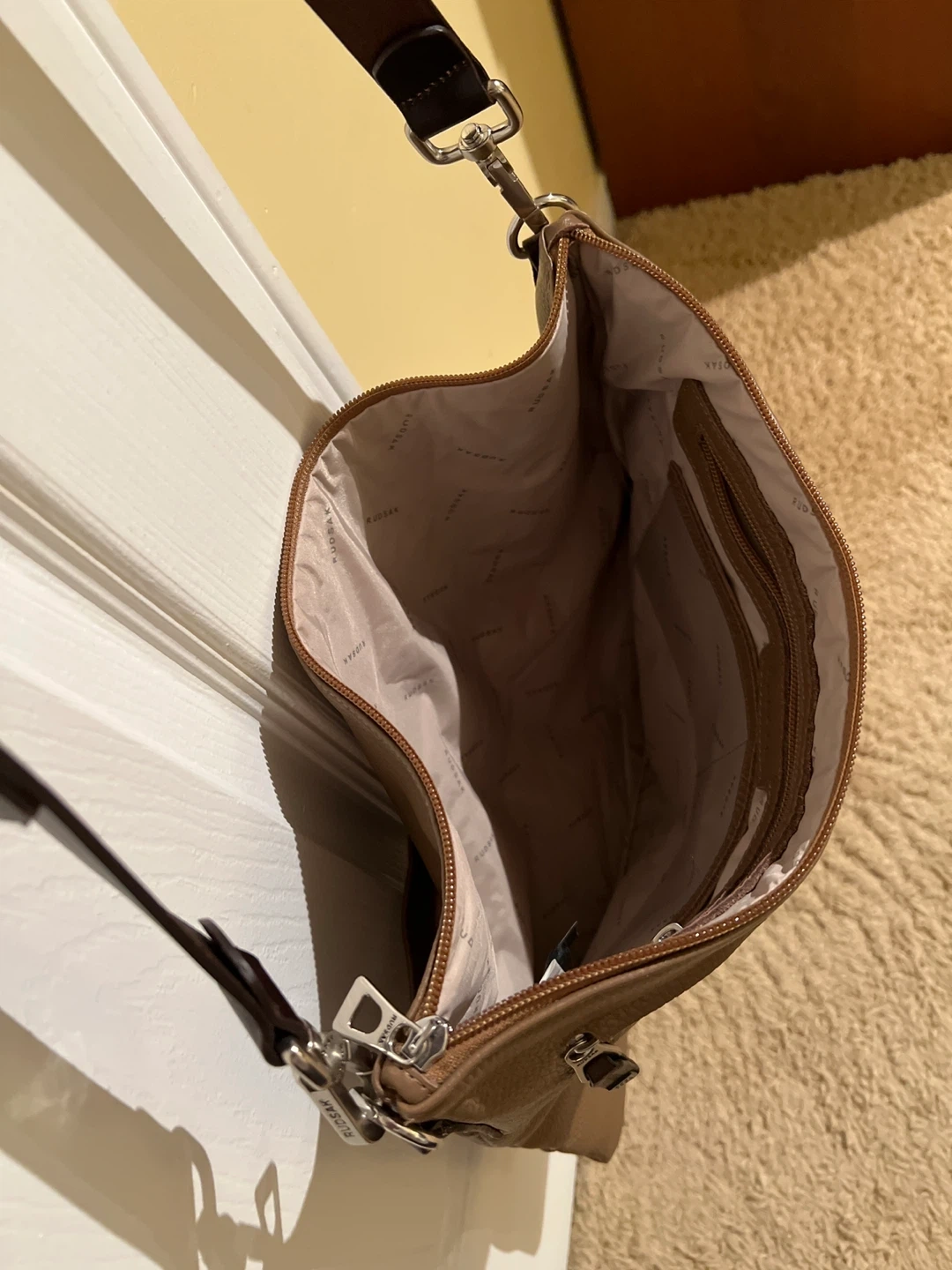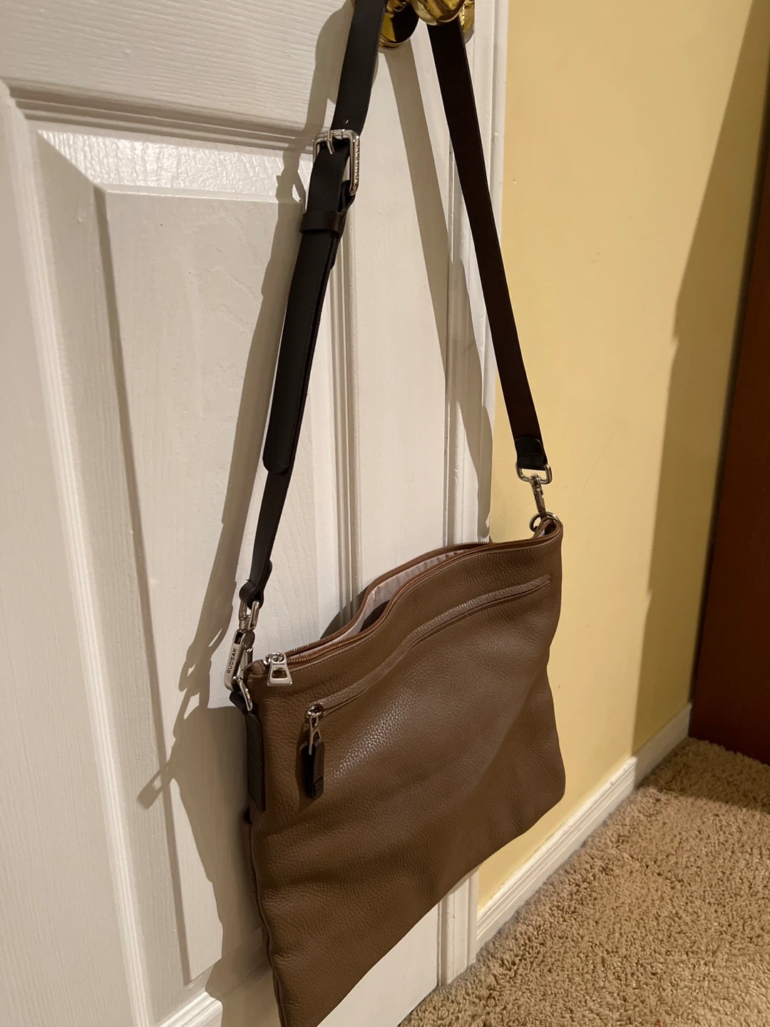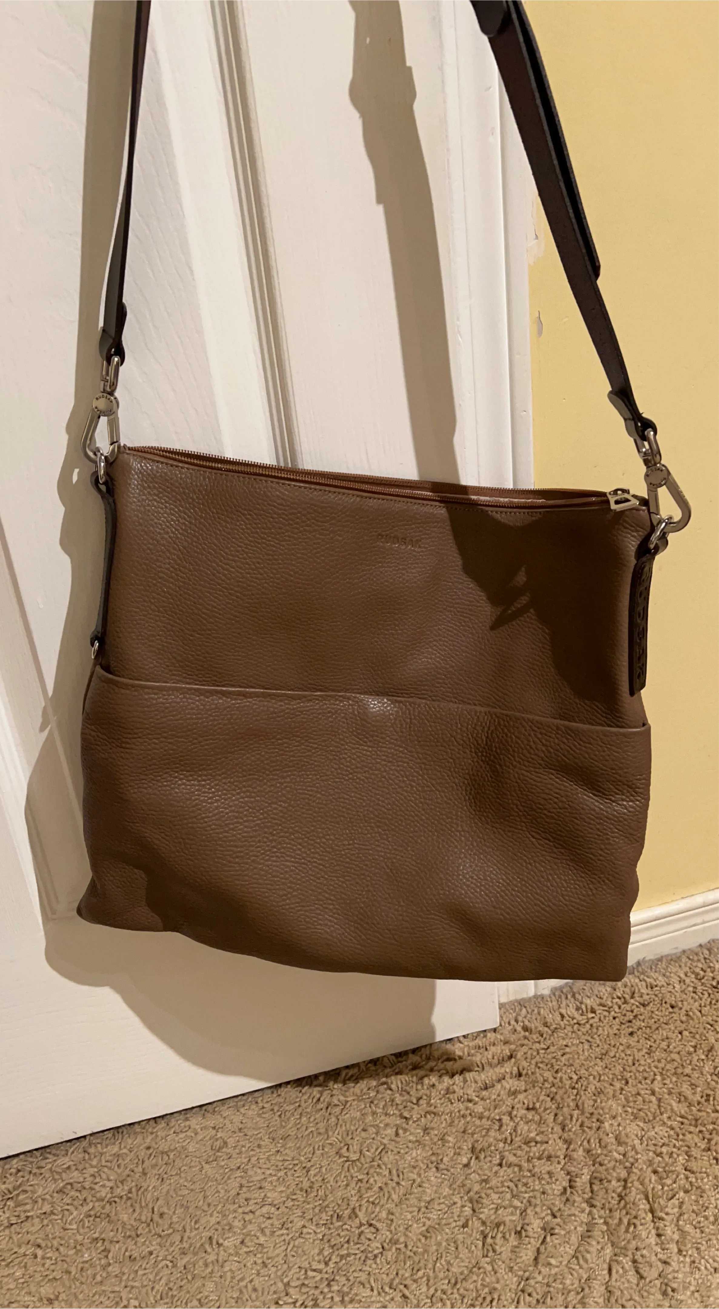 A stylish brown leather crossbody bag from RUDSAK. It features a zip-top closure with front pockets. Genuine leather material.