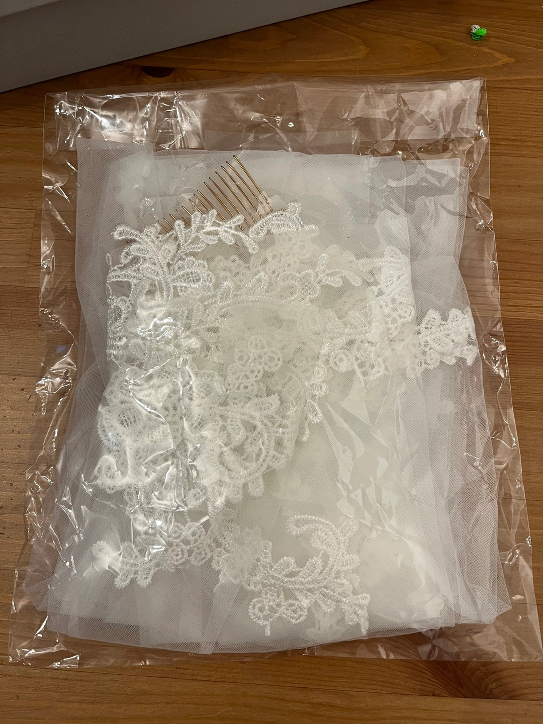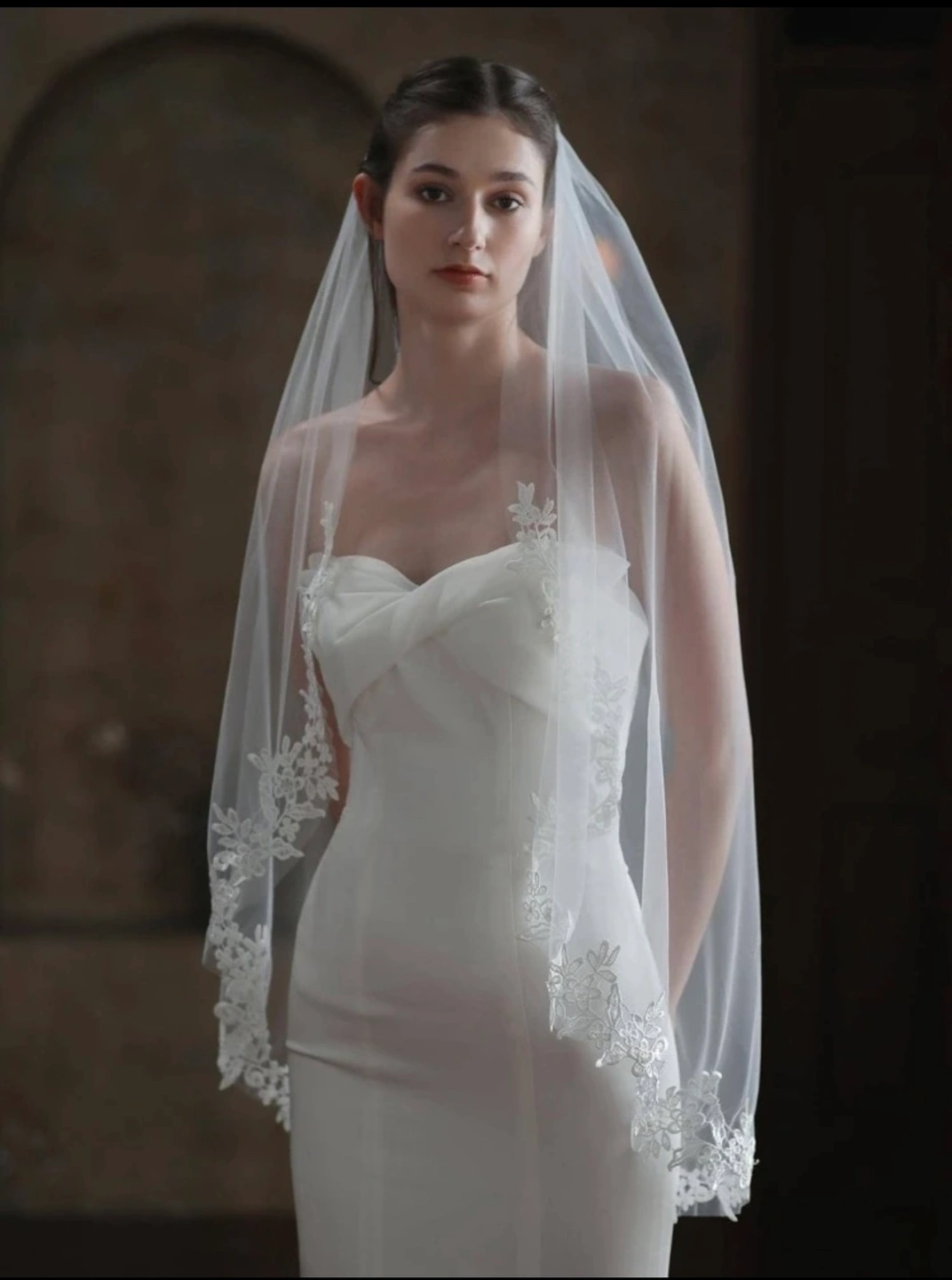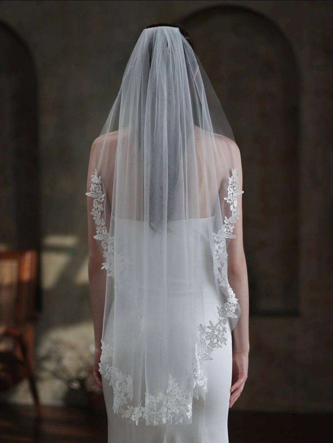 This veil is single layer, white, and has a comb to secure it to your hair. It is made of soft tulle and has delicate lace trim around the edge. The lace is intricate and has a floral design. The veil is 1 tier and is fingertip length.