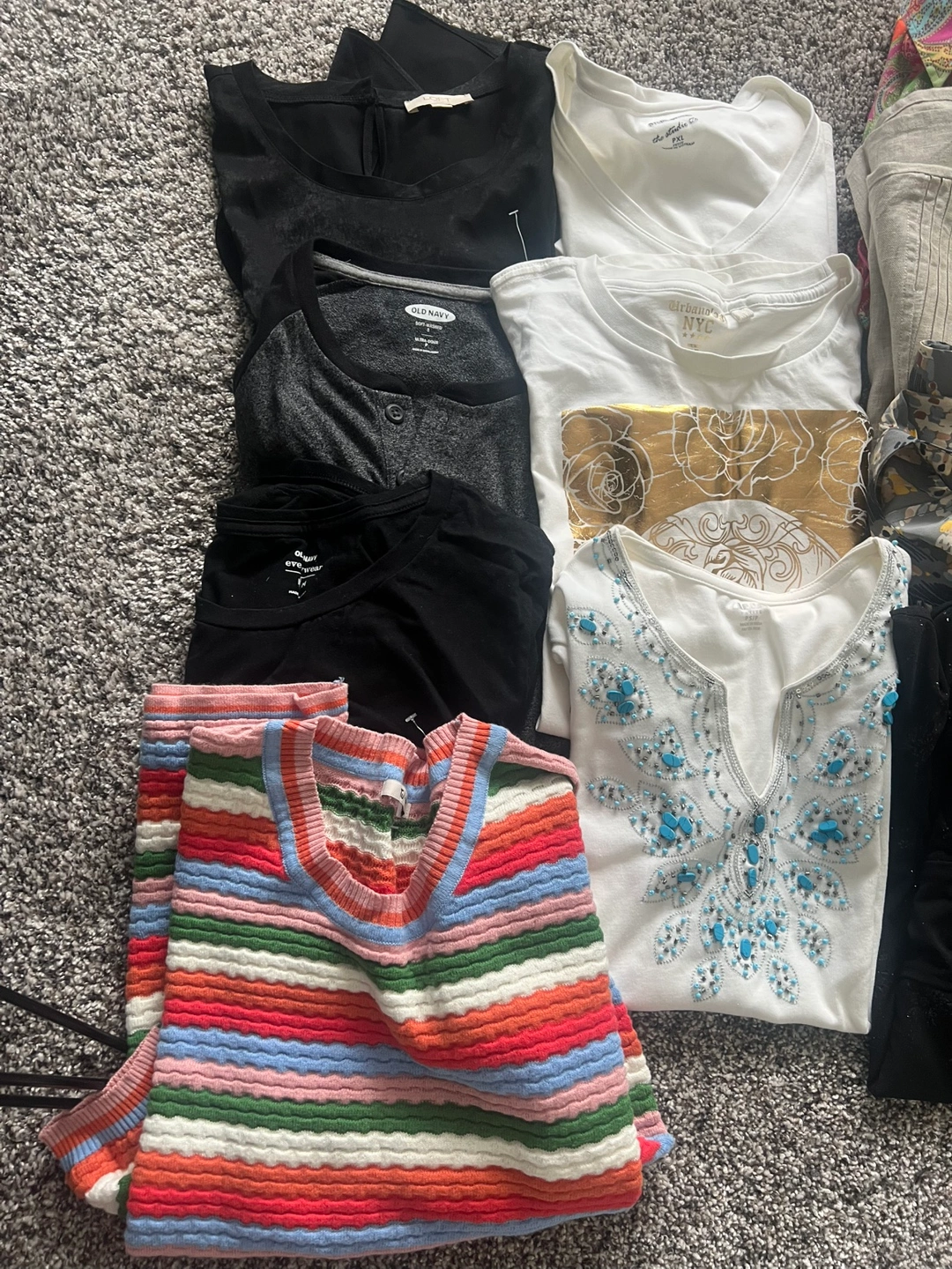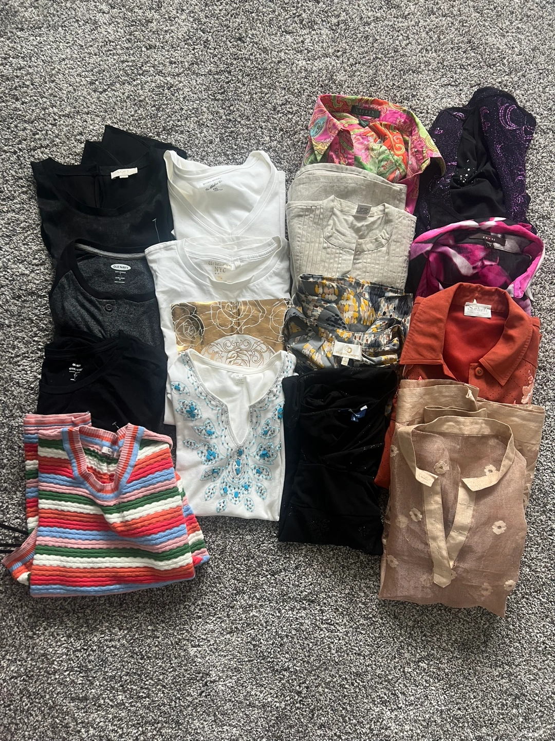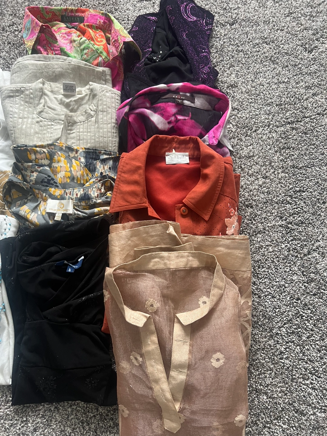 Large bundle of women's tops and blouses. Assorted colours, patterns, and fabrics. Includes several t-shirts, long-sleeved shirts, and blouses. Great for layering or mixing and matching. Sizes vary.