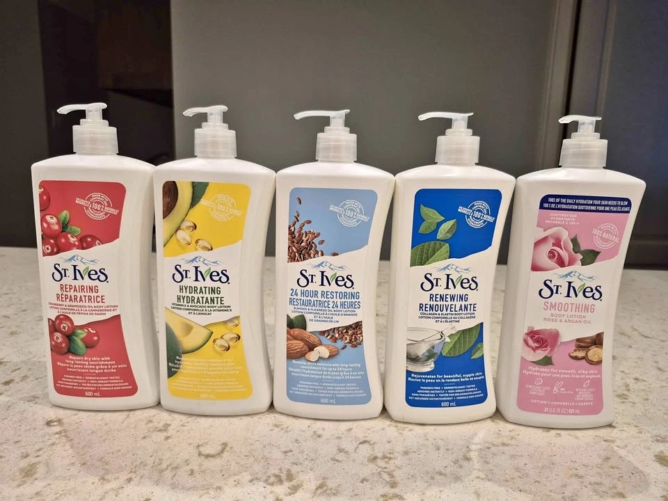 Great lot of St. Ives body lotions. Has 5 different kinds for your skin. You get Repairing Cranberry, Hydrating Avocado, 24 Hour Restoring Almond, Renewing Collagen, and Smoothing Rose. Most bottles are 600 mL, one is 621 mL. Good for keeping skin moisturized. $5 each or 5 for $20.