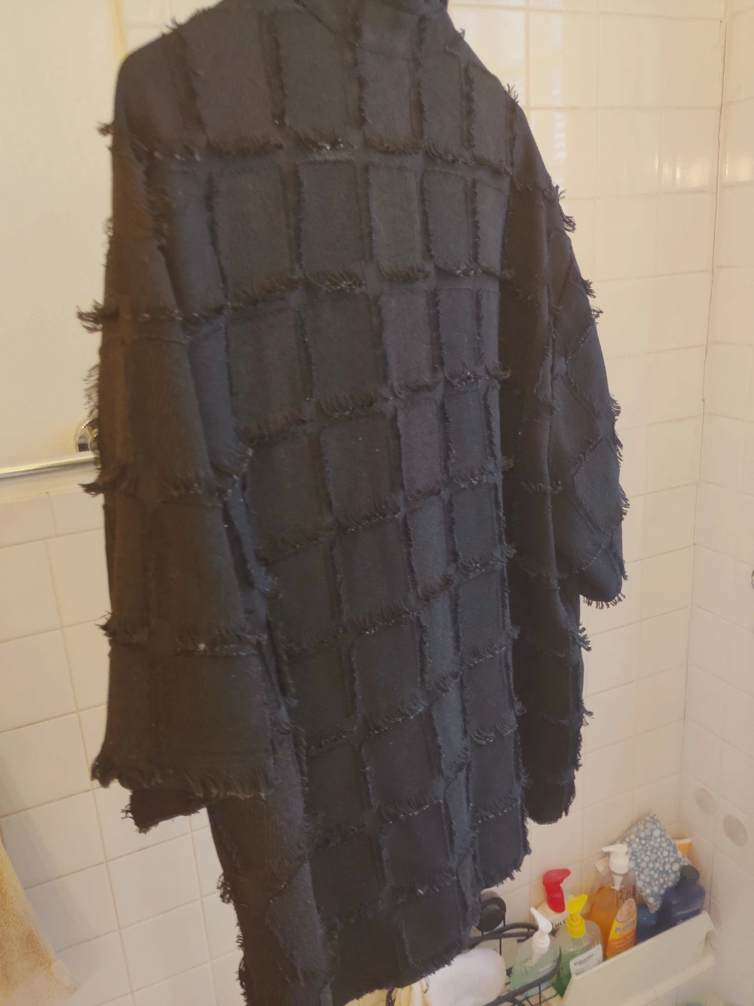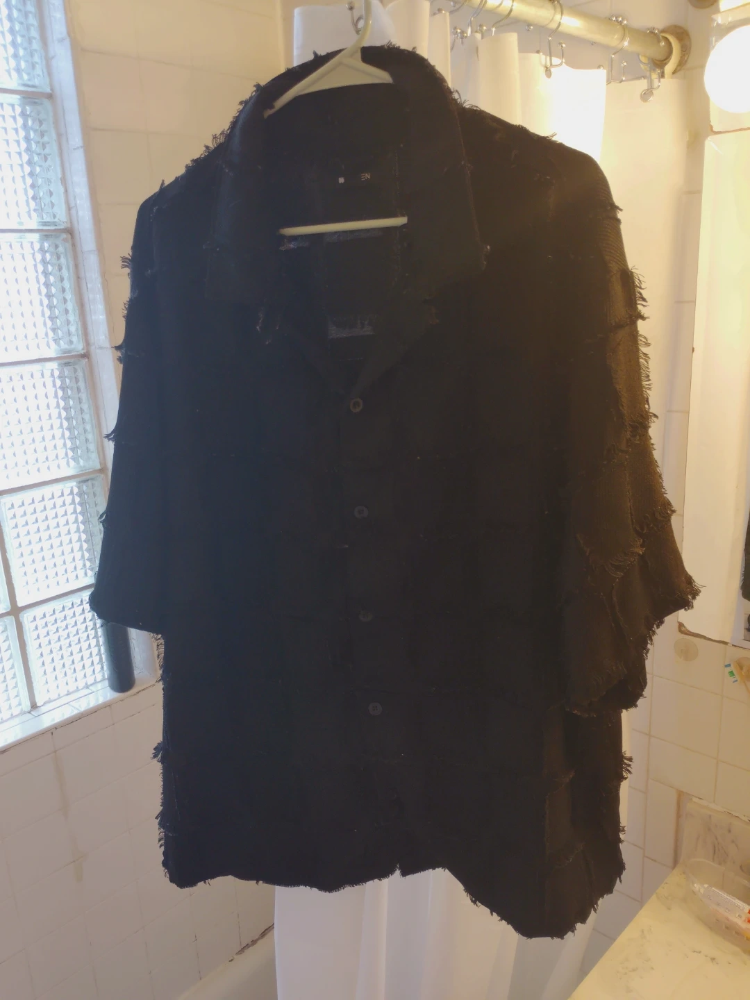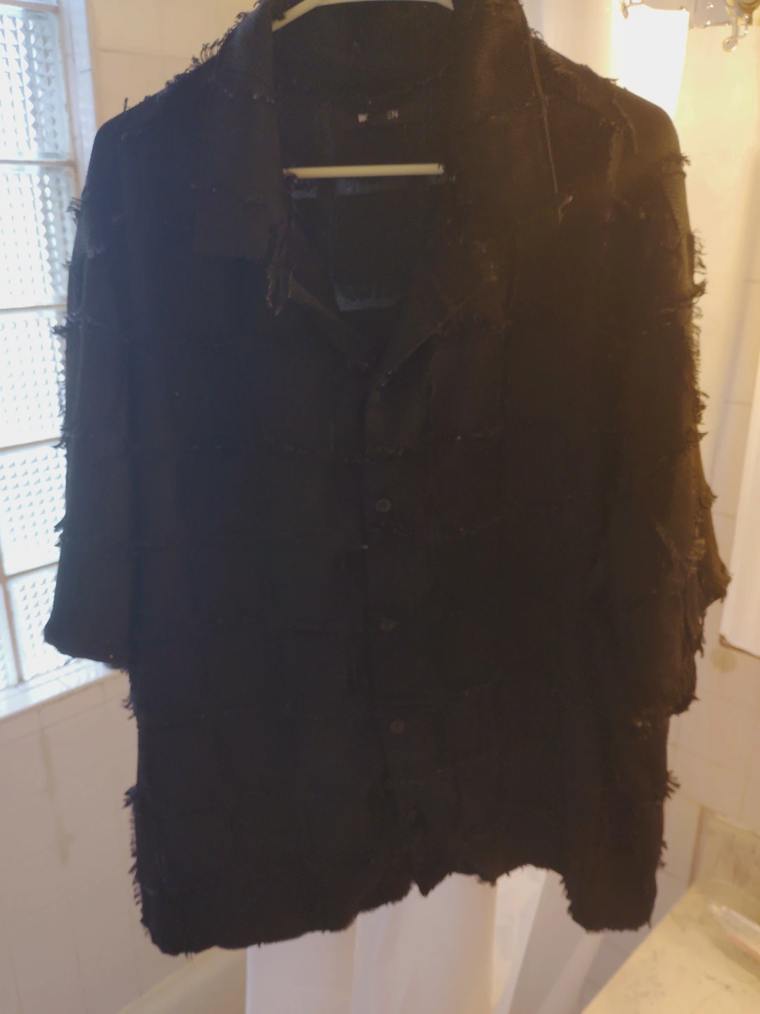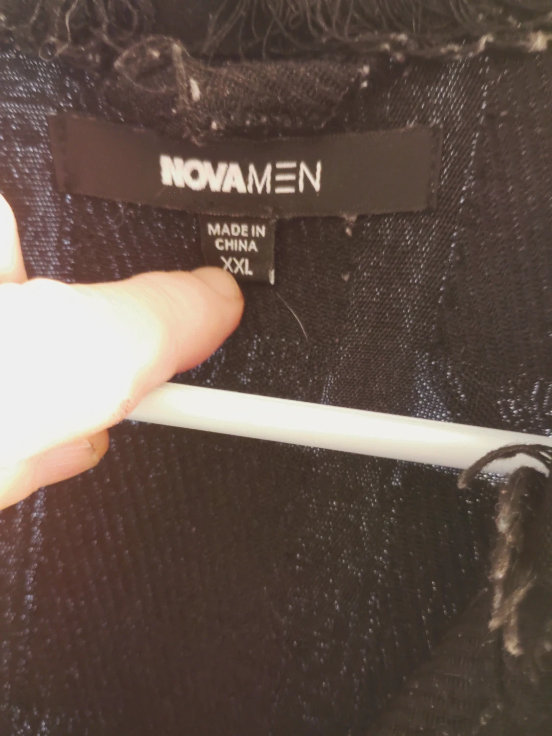NOVAMEN men's black shirt jacket. Features a unique textured patchwork design with frayed edges. Button-up front and collar. Size XXL.
