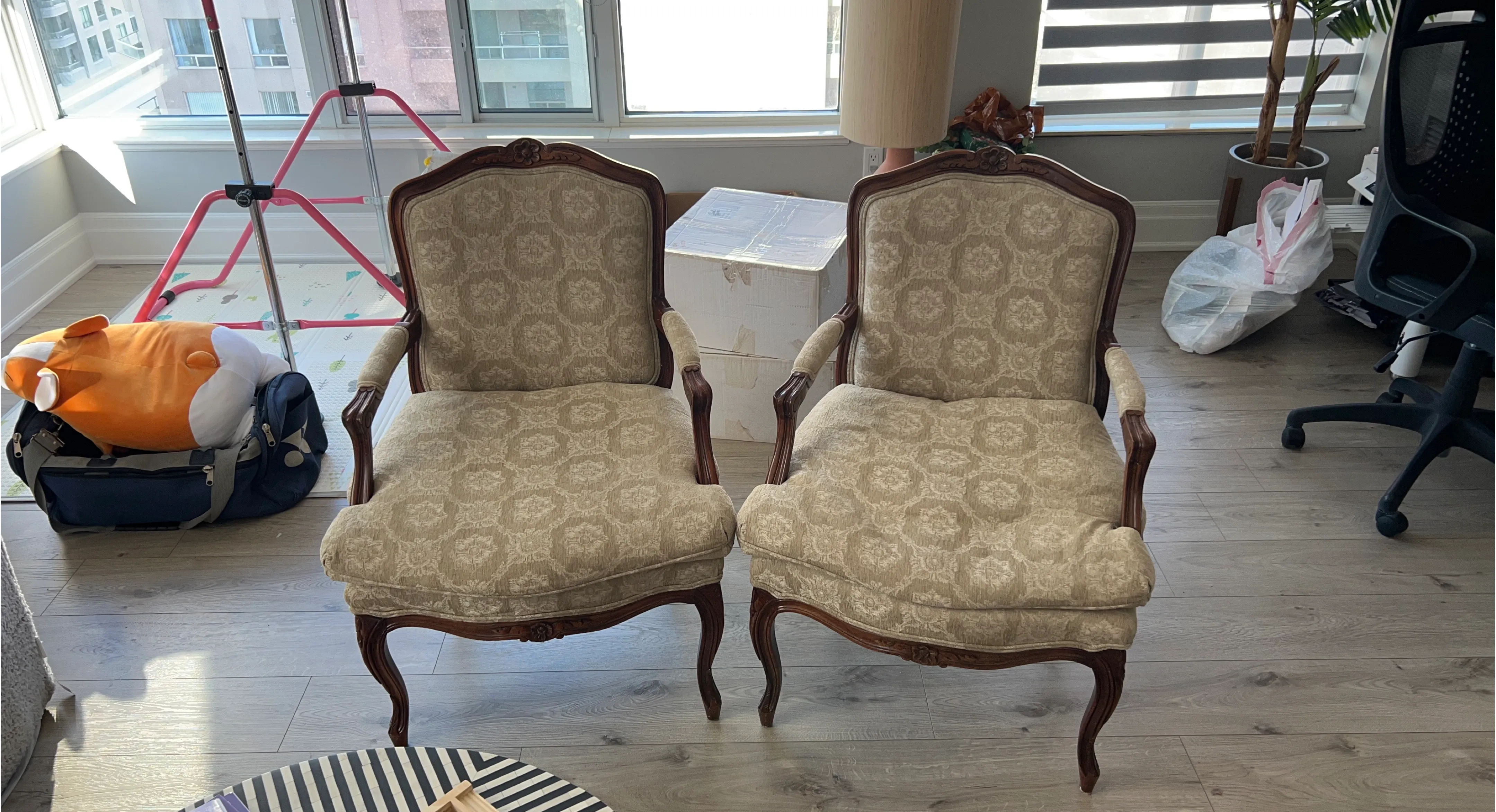 Two vintage accent chairs with ornate carved wood frames and floral upholstery. Their classic design adds a touch of elegance to any room. Suitable for living areas or bedrooms.