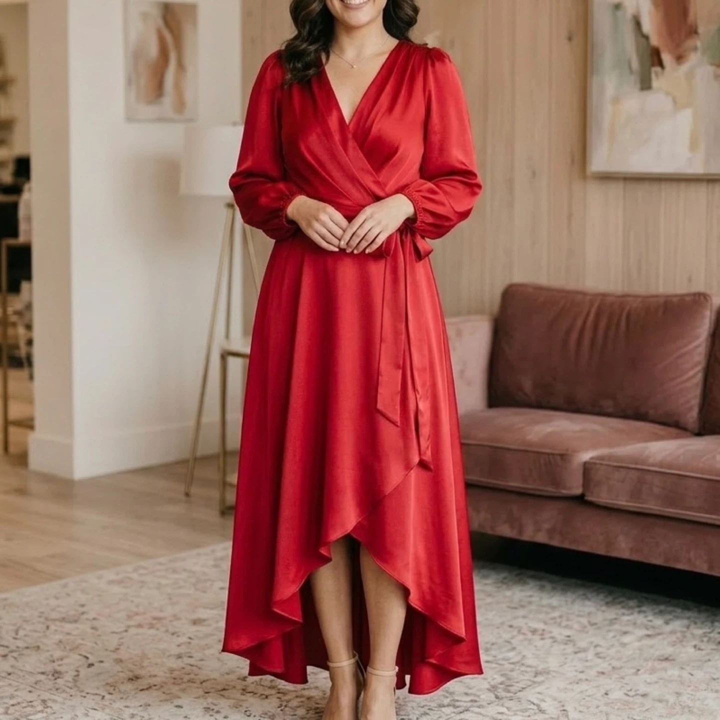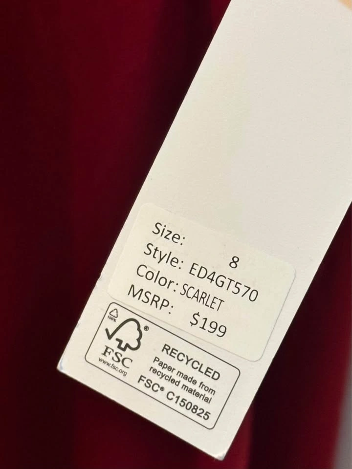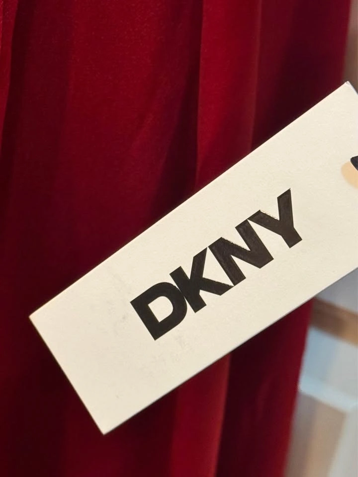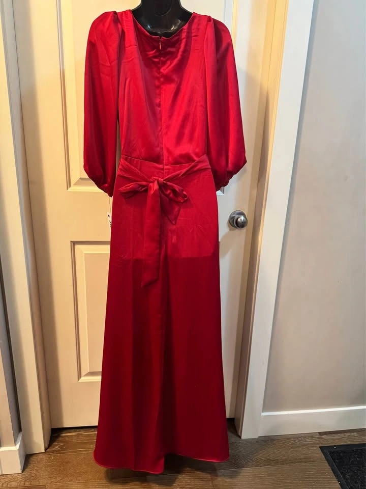 Brand new with tags DKNY satin maxi dress in a stunning scarlet red. This elegant wrap-style gown features a flattering V-neckline, softly gathered shoulders, long blouson sleeves, and a self-tie waist that cinches beautifully for a feminine silhouette. The flowing full-length skirt drapes effortlessly, making it perfect for formal events, weddings, holiday parties, or special evenings out.