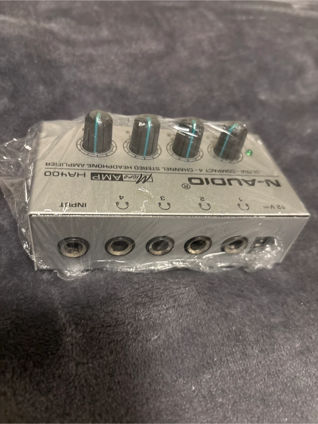 This is an N-AUDIO HA400 ultra-compact headphone amplifier. It's a 4-channel stereo unit. Has four 3.5mm headphone outputs and independent level controls.