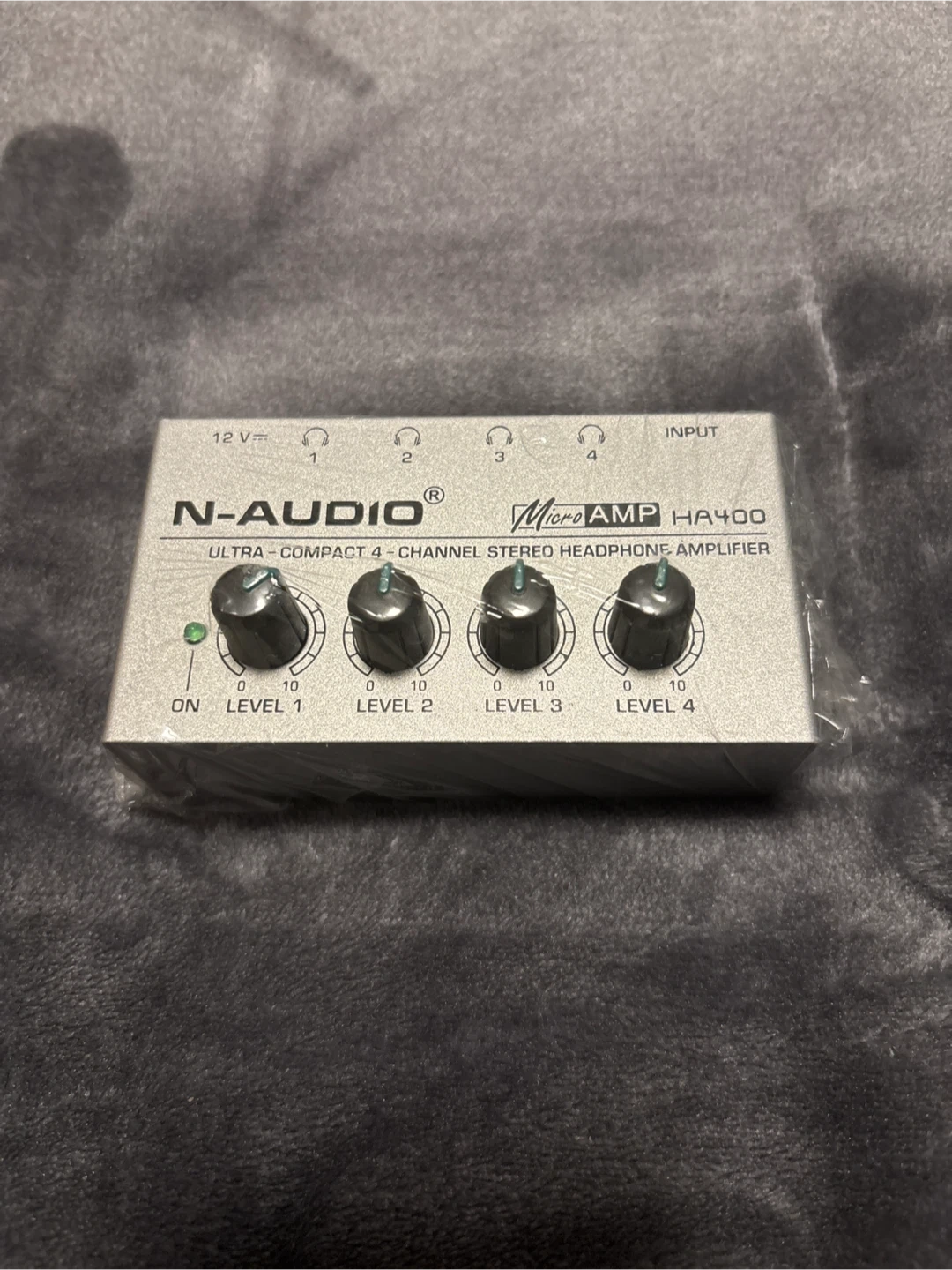 This is an N-AUDIO HA400 ultra-compact headphone amplifier. It's a 4-channel stereo unit. Has four 3.5mm headphone outputs and independent level controls.