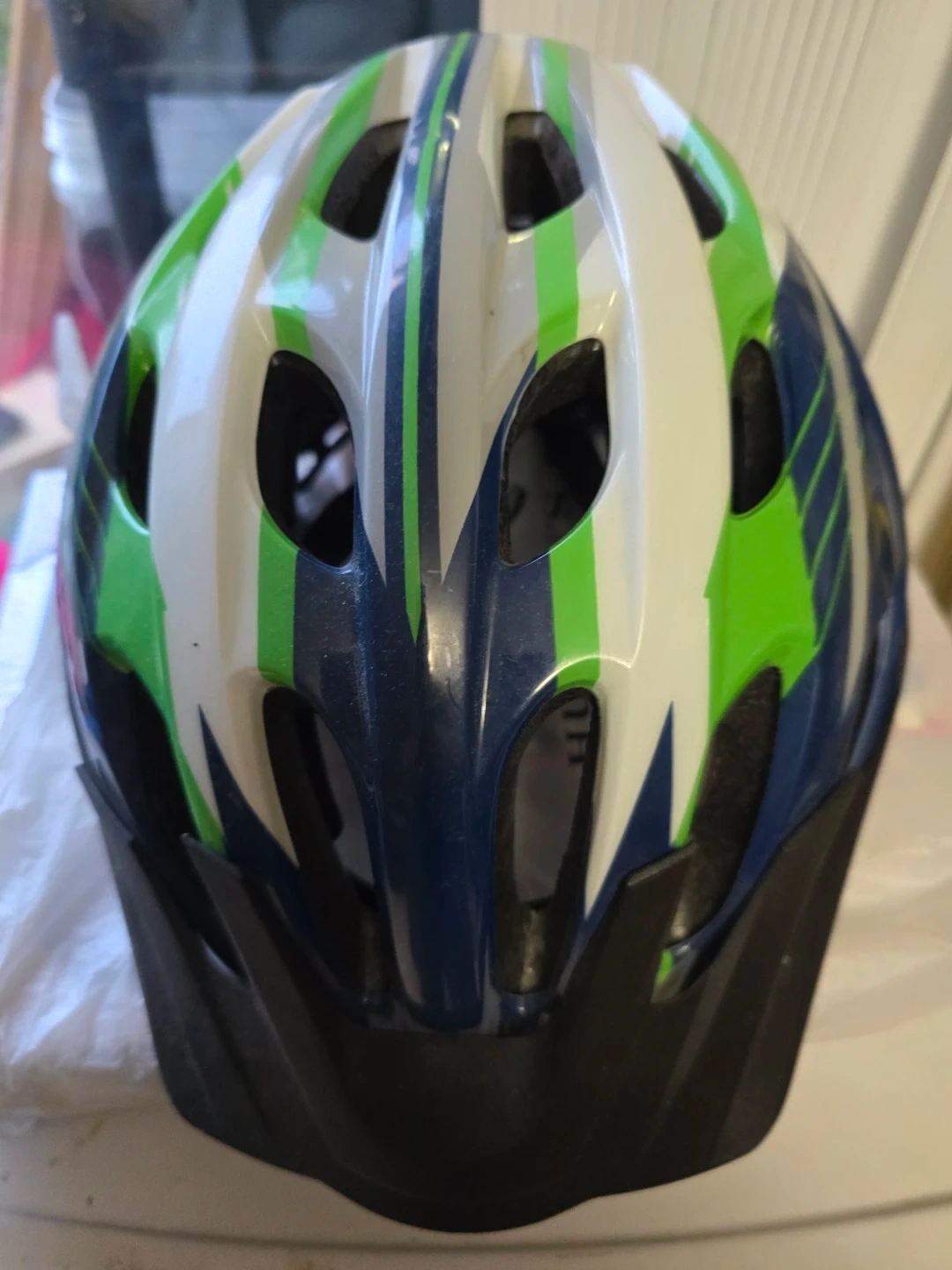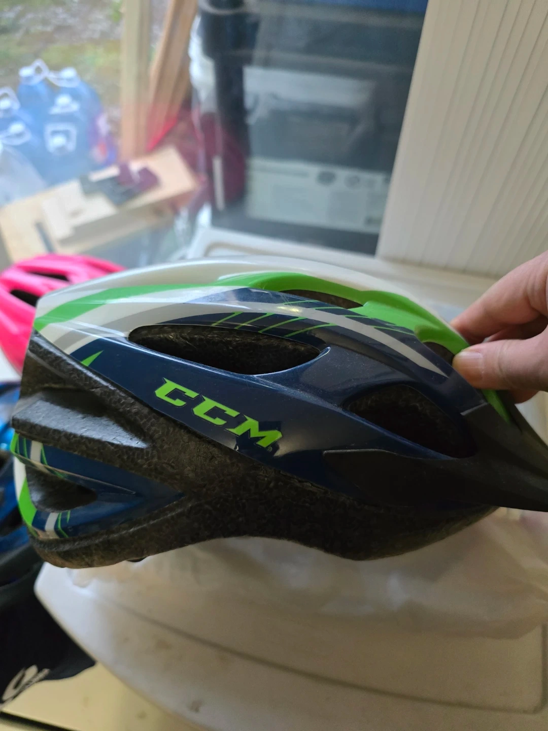 This CCM Nexus youth helmet is designed for cycling safety. It features a blue, white, and green colour scheme with multiple vents for airflow. The size is adjustable from 54-58cm. It's suitable for young riders needing head protection.