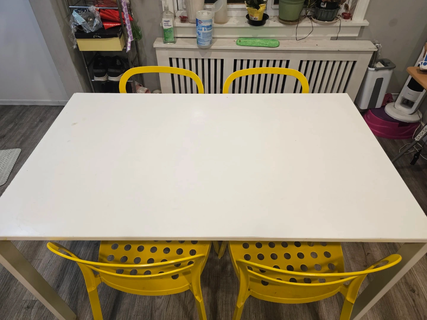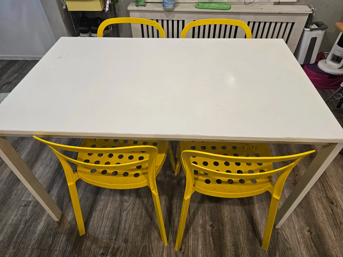White laminate dining table with four bright yellow chairs. Perfect for a breakfast nook or small dining area. Chairs stackable for easy storage.