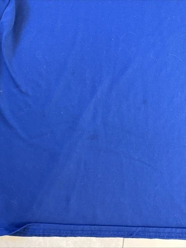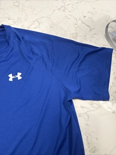 This is a loose fitting Under Armour blue T-shirt for men in size large. Please look at the pictures. There appear to be a couple of faint marks on the front, but they are not very noticeable when wearing it.