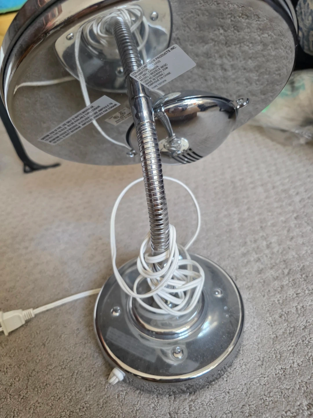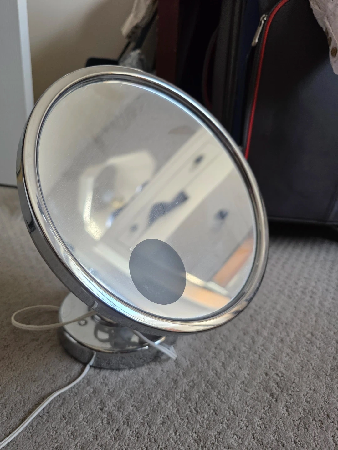 This is a silver vanity mirror with a flexible neck and a circular base. It's powered by a cord with a standard plug. The mirror is double-sided and swivels for easy adjustment. It's great for applying makeup or any detailed grooming task.