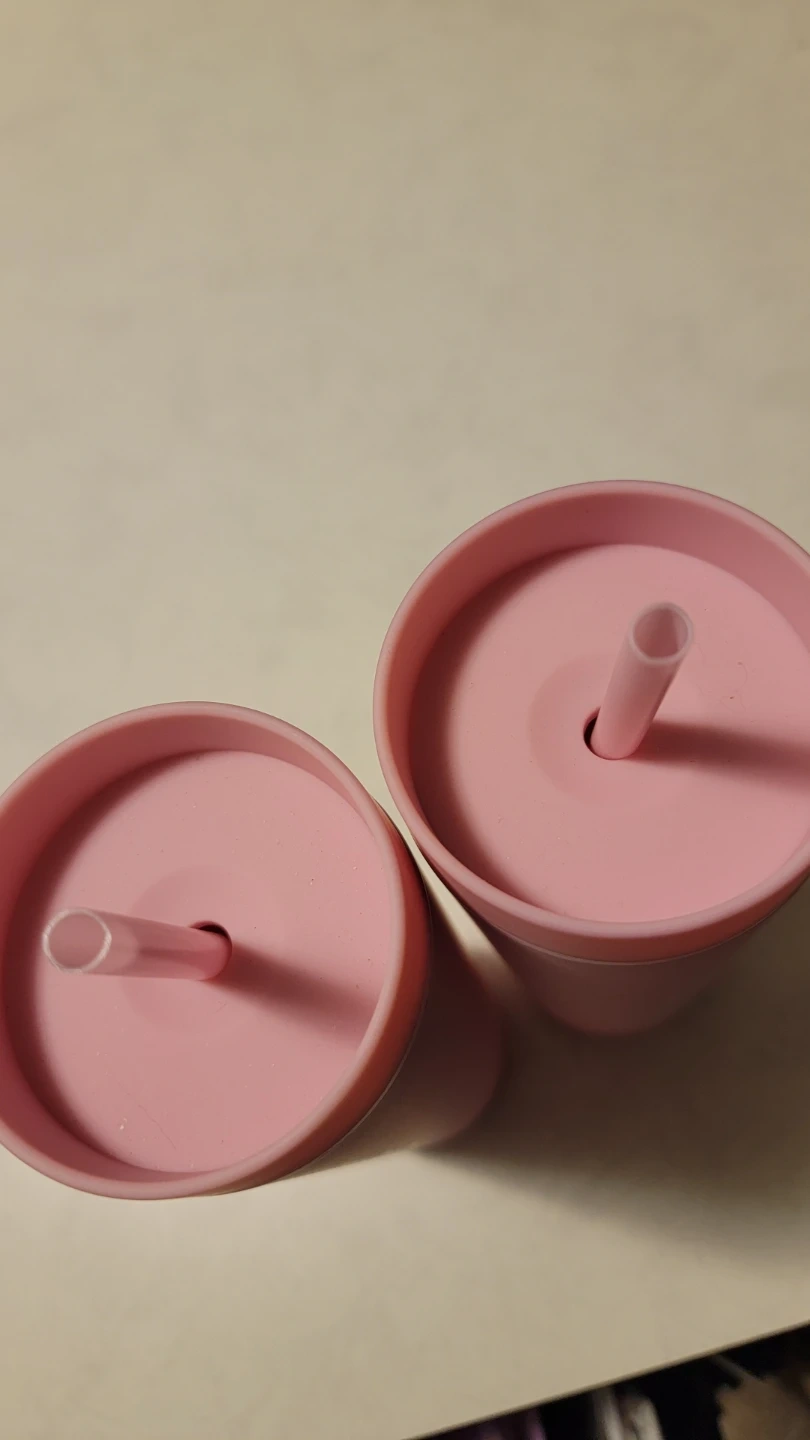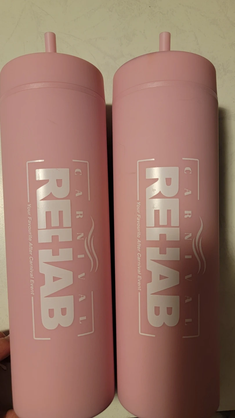 Set of two BPA free pink tumblers labelled 'Carnival Rehab'. They come with straws attached. Perfect for staying hydrated after a fun event!