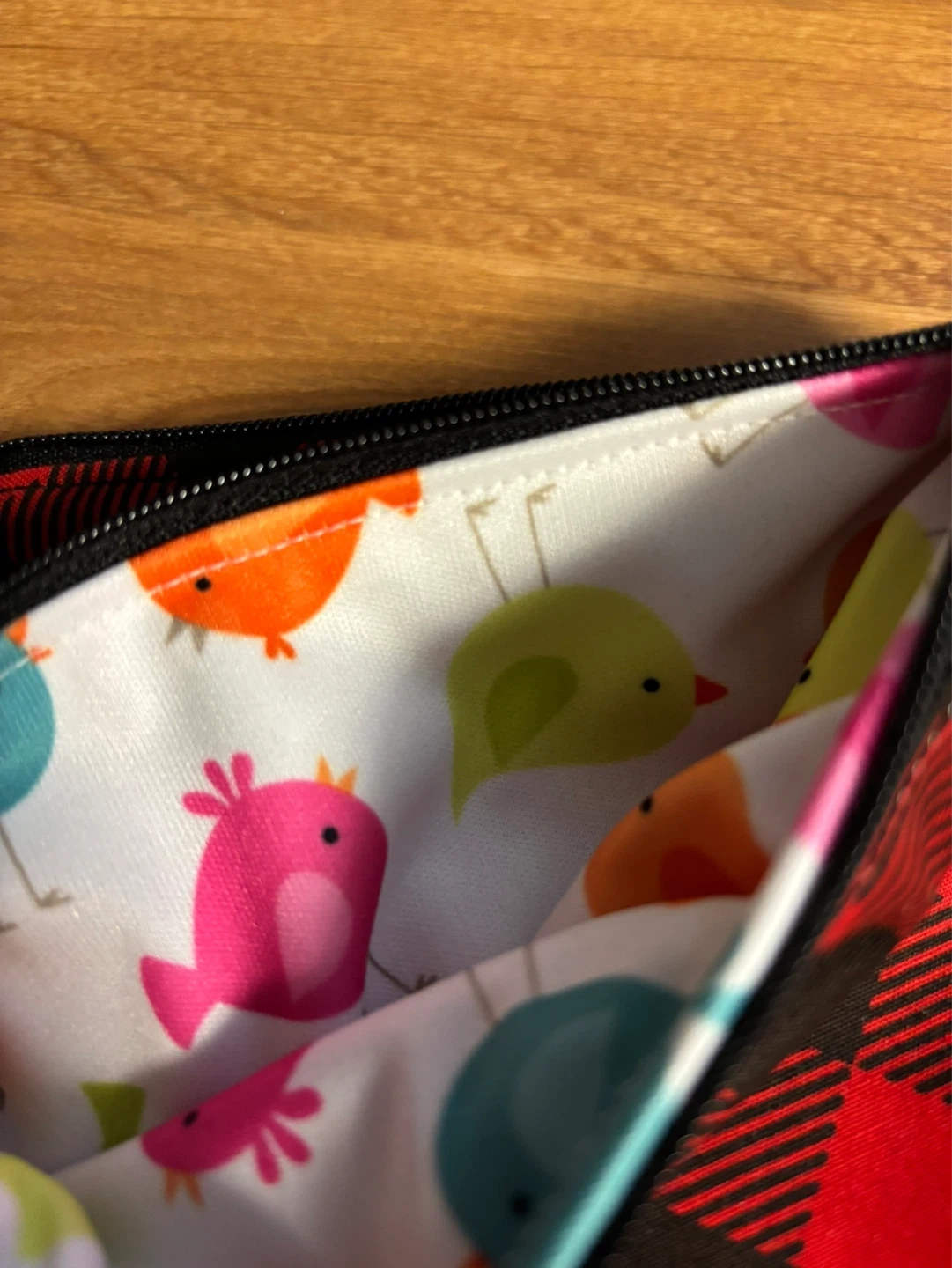 Set of two zipper pouches. Features a classic red and black buffalo plaid exterior. The interior lining is white with a cute print of colourful cartoon birds. Zipper closure on both.