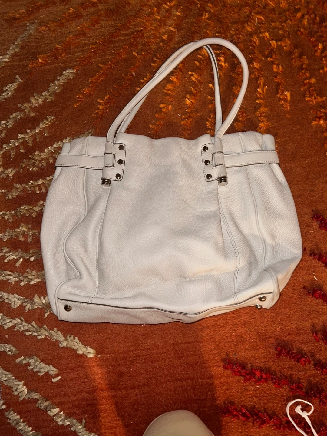 Stylish white leather shoulder bag with silver hardware. It has a soft, pebbled leather finish and comfortable shoulder straps. The bag offers ample space for your essentials.
