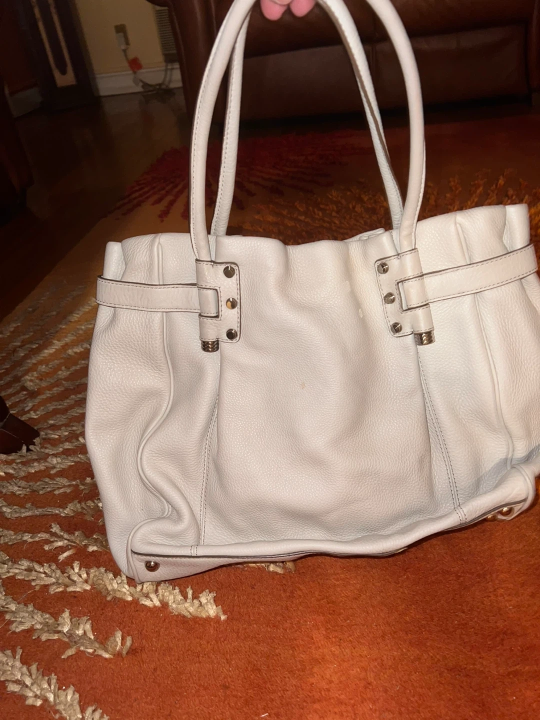 Stylish white leather shoulder bag with silver hardware. It has a soft, pebbled leather finish and comfortable shoulder straps. The bag offers ample space for your essentials.