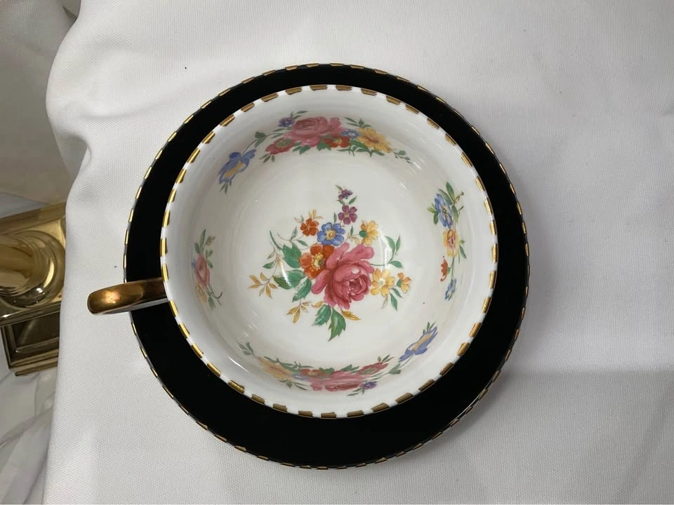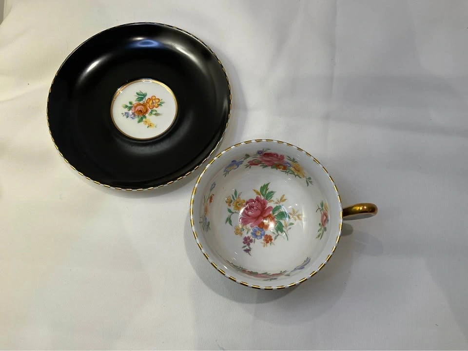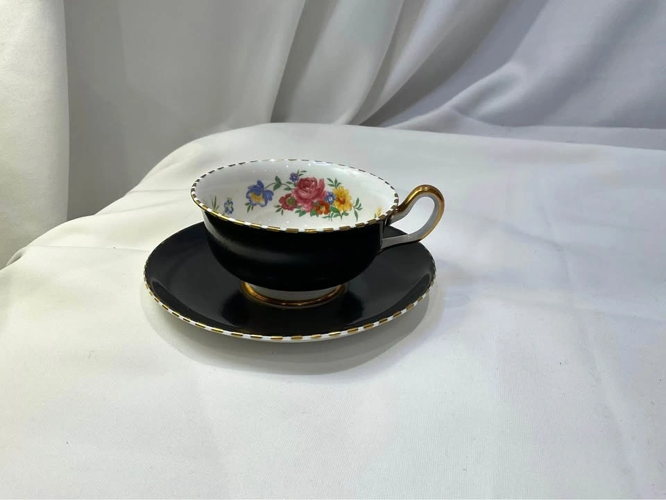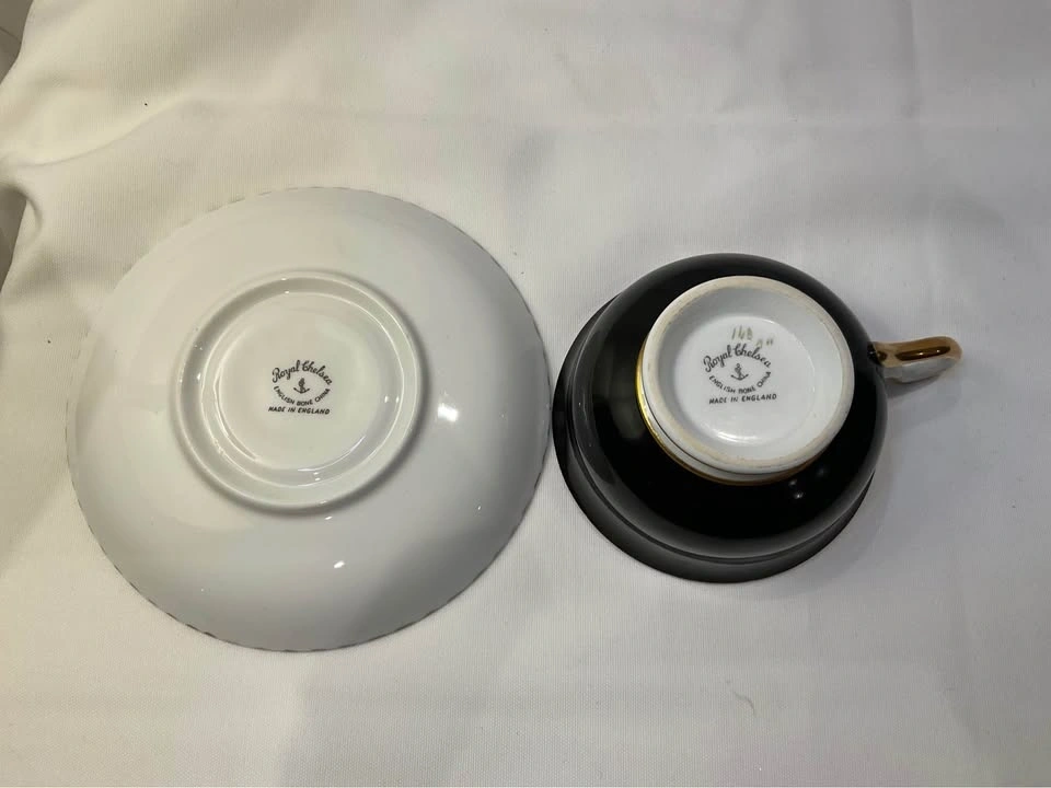 Royal Chelsea Vintage Tea Cup Cabbage Rose Black Teacup & Saucer