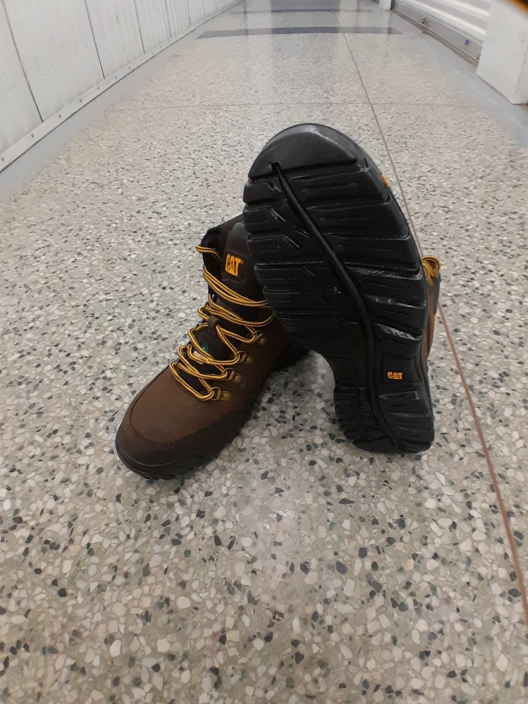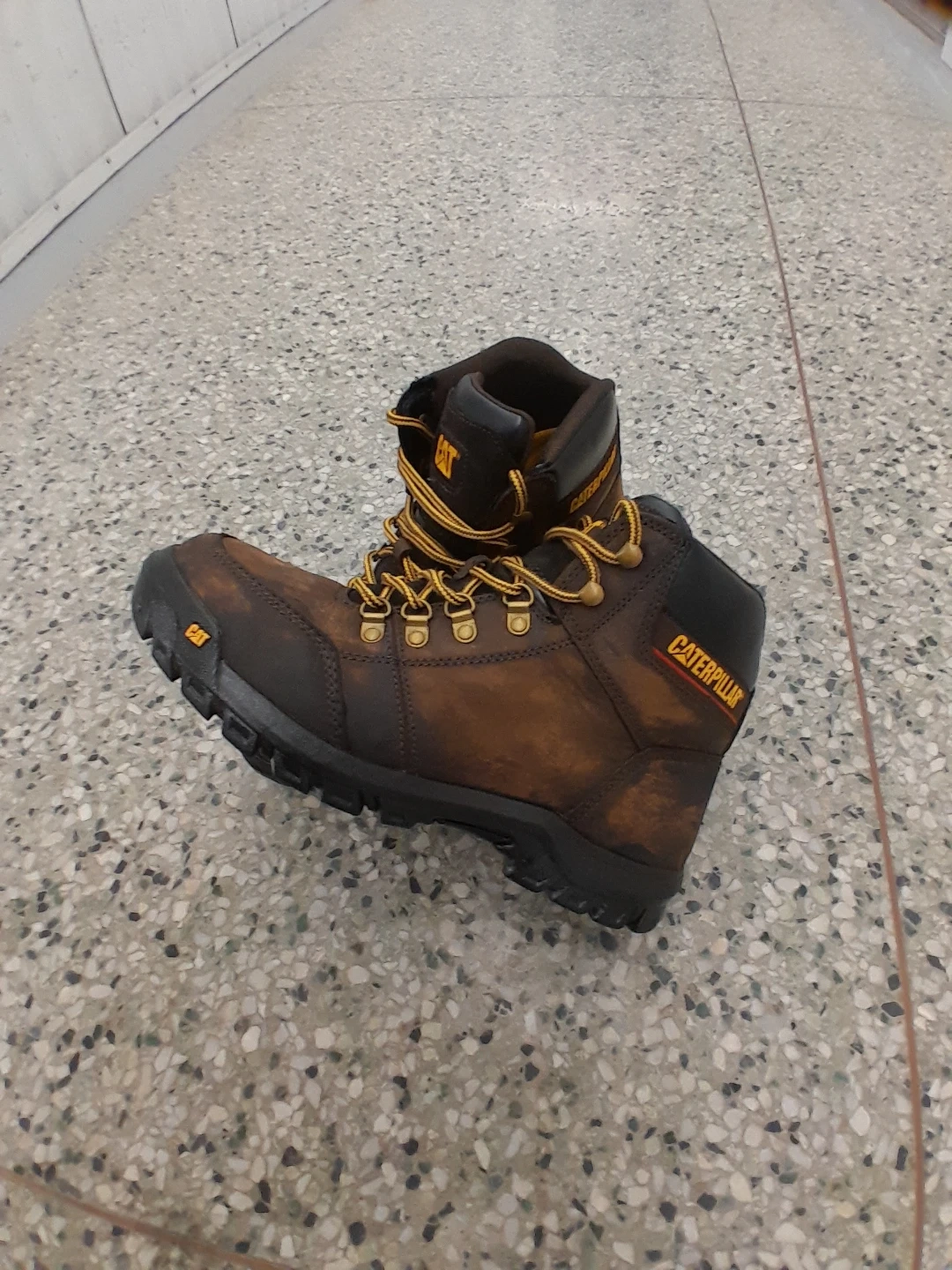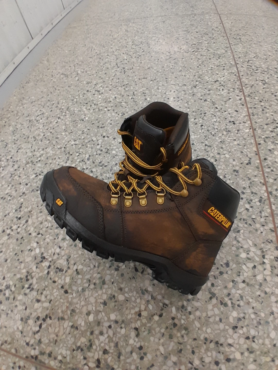 Brown Original Caterpillar Safety boots with yellow laces. These sturdy boots offer good ankle support and a durable sole. Excellent for construction or heavy-duty work! Men's Size 9.5 suitable for size 10