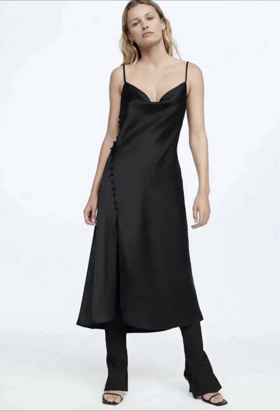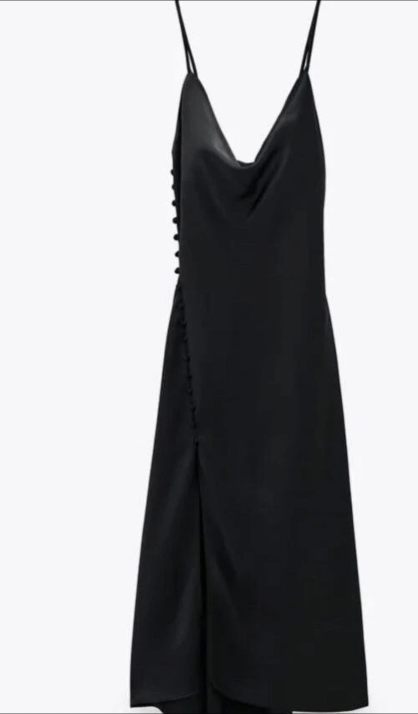 Zara Black Satin Slip Dress with Leg Slit & Button Details Size Small