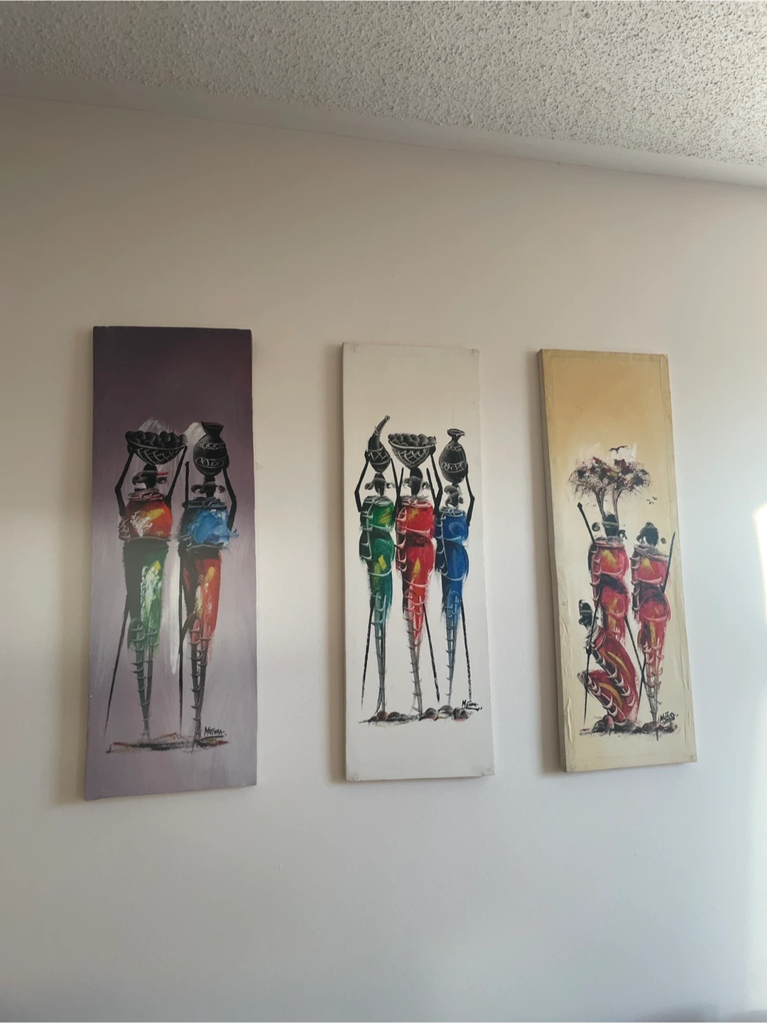 Three vertical canvases depicting figures carrying baskets. The paintings showcase vibrant colors and a unique artistic style. Great for adding a touch of culture to your home decor!