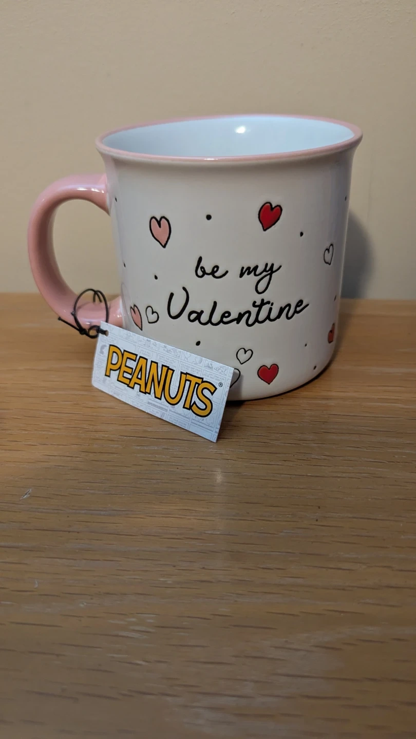 This charming Peanuts mug features Snoopy on an envelope with hearts and the "be my Valentine" message. It has a pink handle and trim. Ceramic construction.
