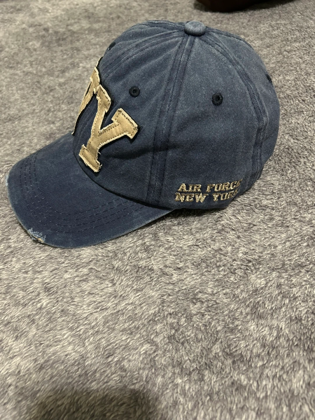 This distressed blue baseball cap features prominent "NY" embroidery on the front and "Air Force New York" on the side. It has an adjustable metal buckle strap for a comfortable fit. A classic casual accessory!