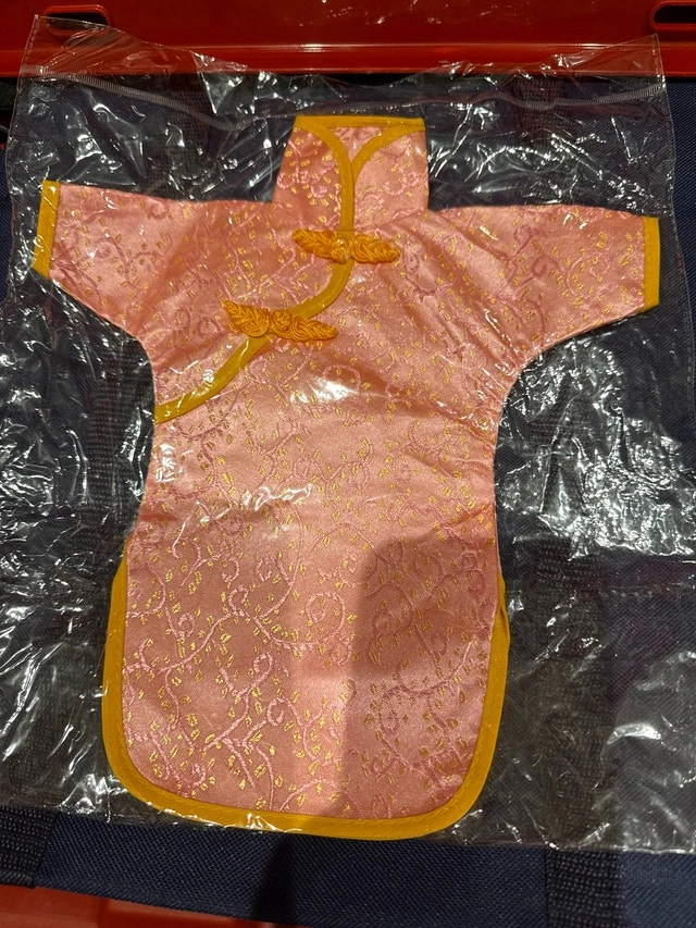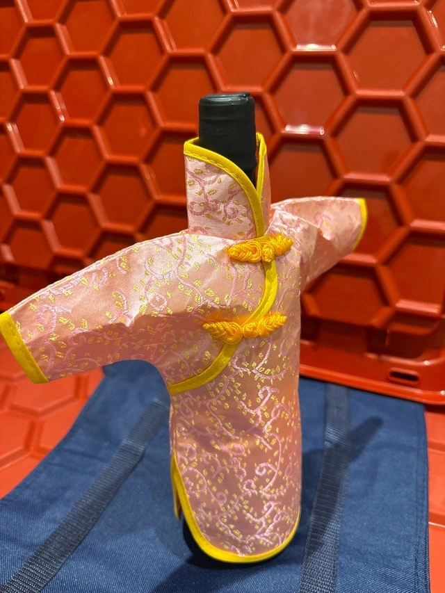 Add a touch of whimsy to your wine presentation with this unique, pre-owned wine bottle cover, designed to resemble a traditional cheongsam dress. * Elegant cheongsam design, brand new * Eye-catching * Makes a great gift This charming cover is sure to spark conversation and add a cultural flair to any gathering. It's perfect for gifting or for simply dressing up your favourite bottle.