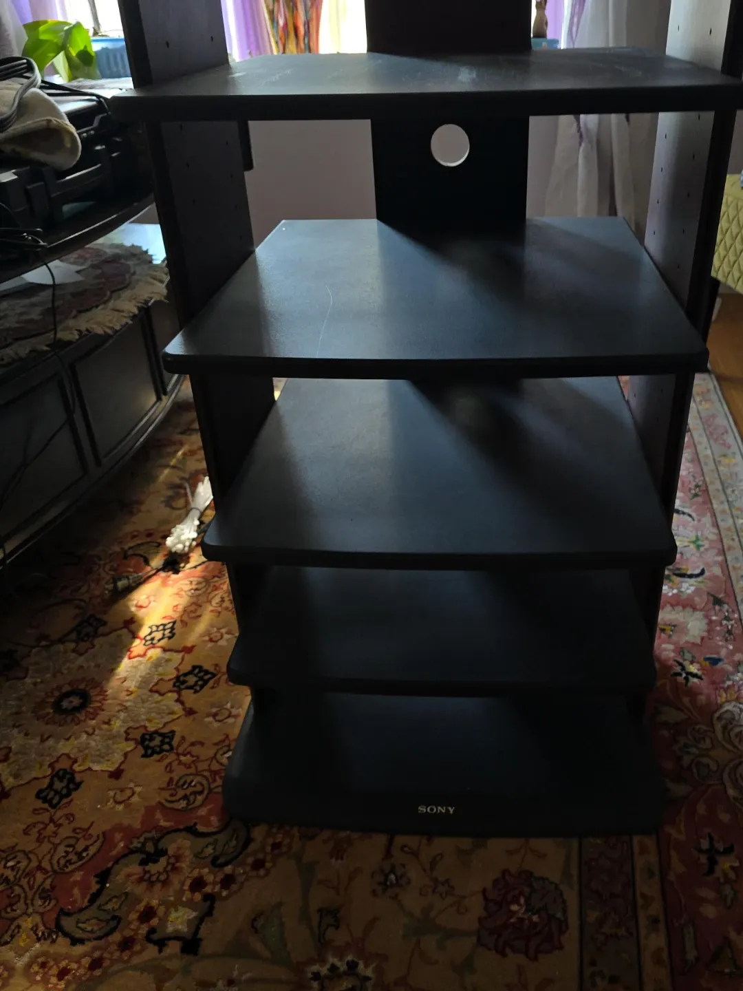 Soney,black 5-shelf media stand with cable management holes. It's made of wood composite. This stand is great for organizing audio and video components.