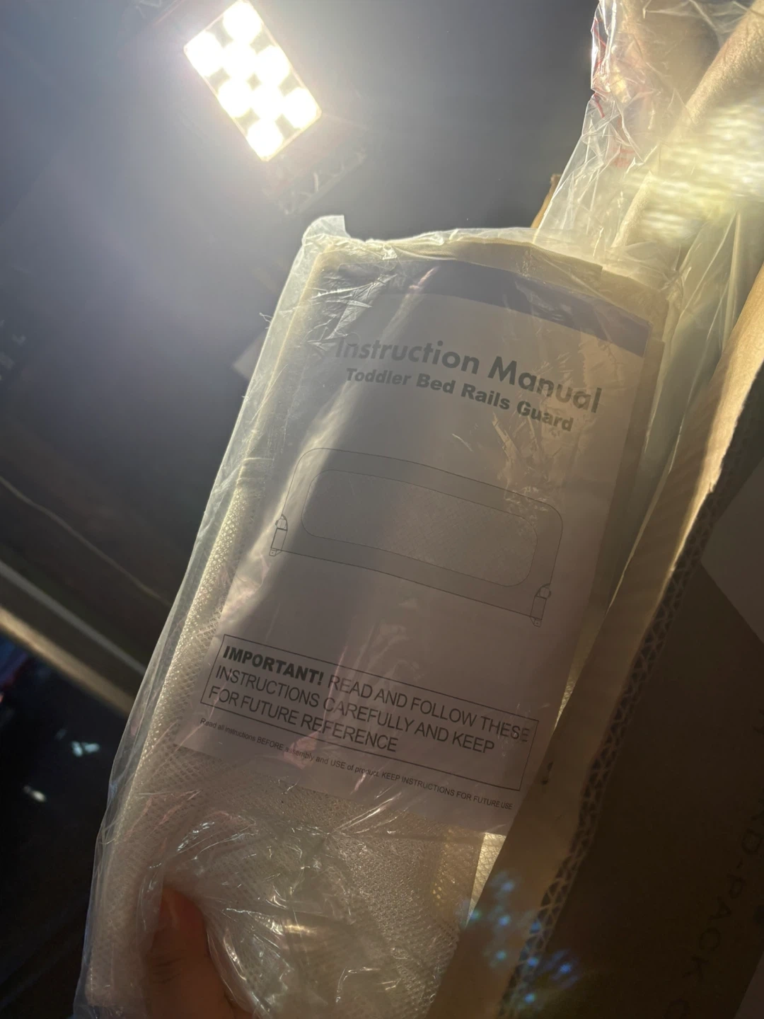 This is a toddler bed rails guard for safety. It includes an instruction manual. It is designed to prevent toddlers from falling out of bed while they sleep.